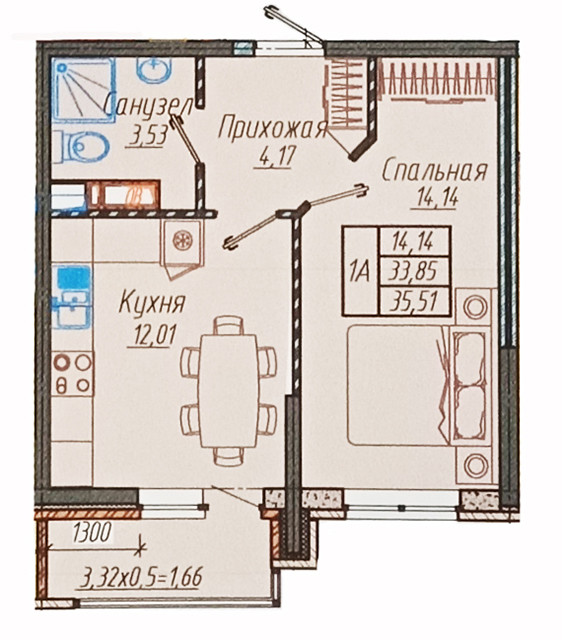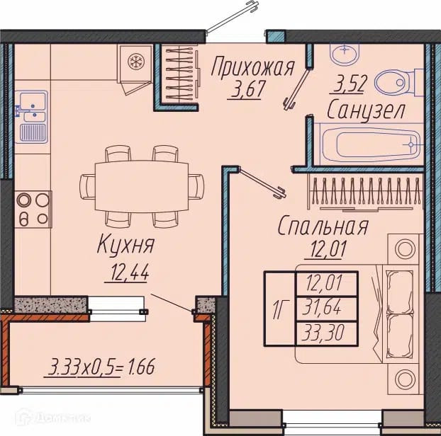 Общая площадь 34 м2