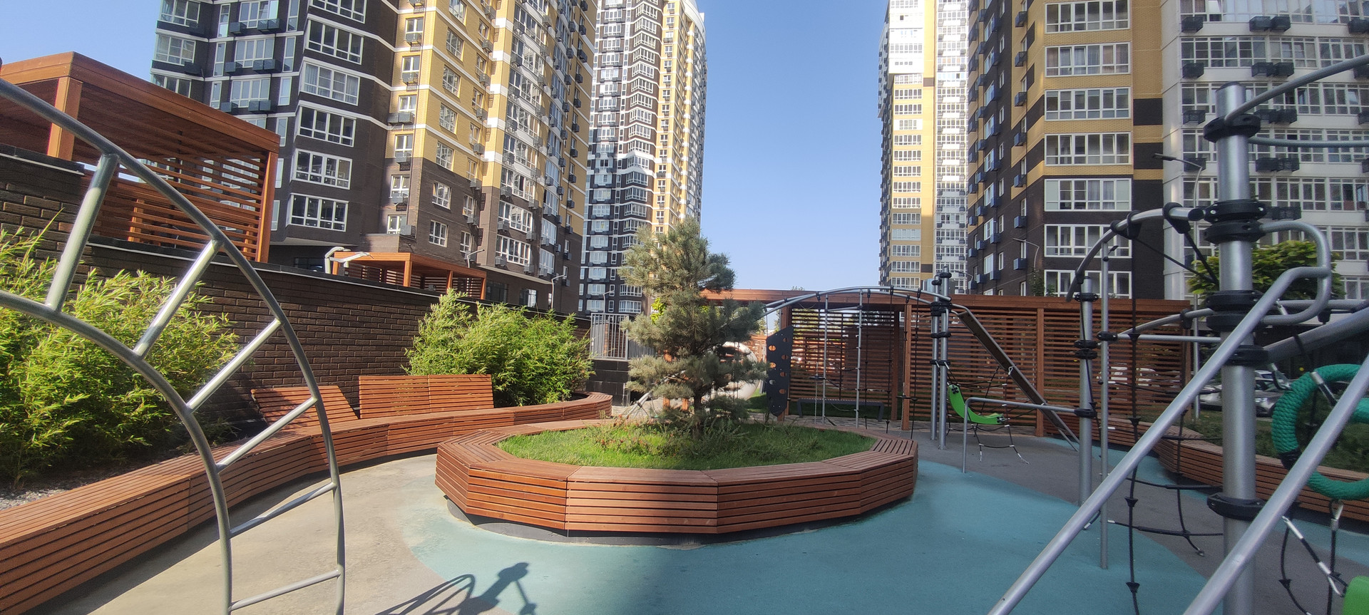 Придомовая территория закрыта. Во дворе установлены детские площадки, зоны для занятий спортом, оборудованные места для спокойного отдыха.