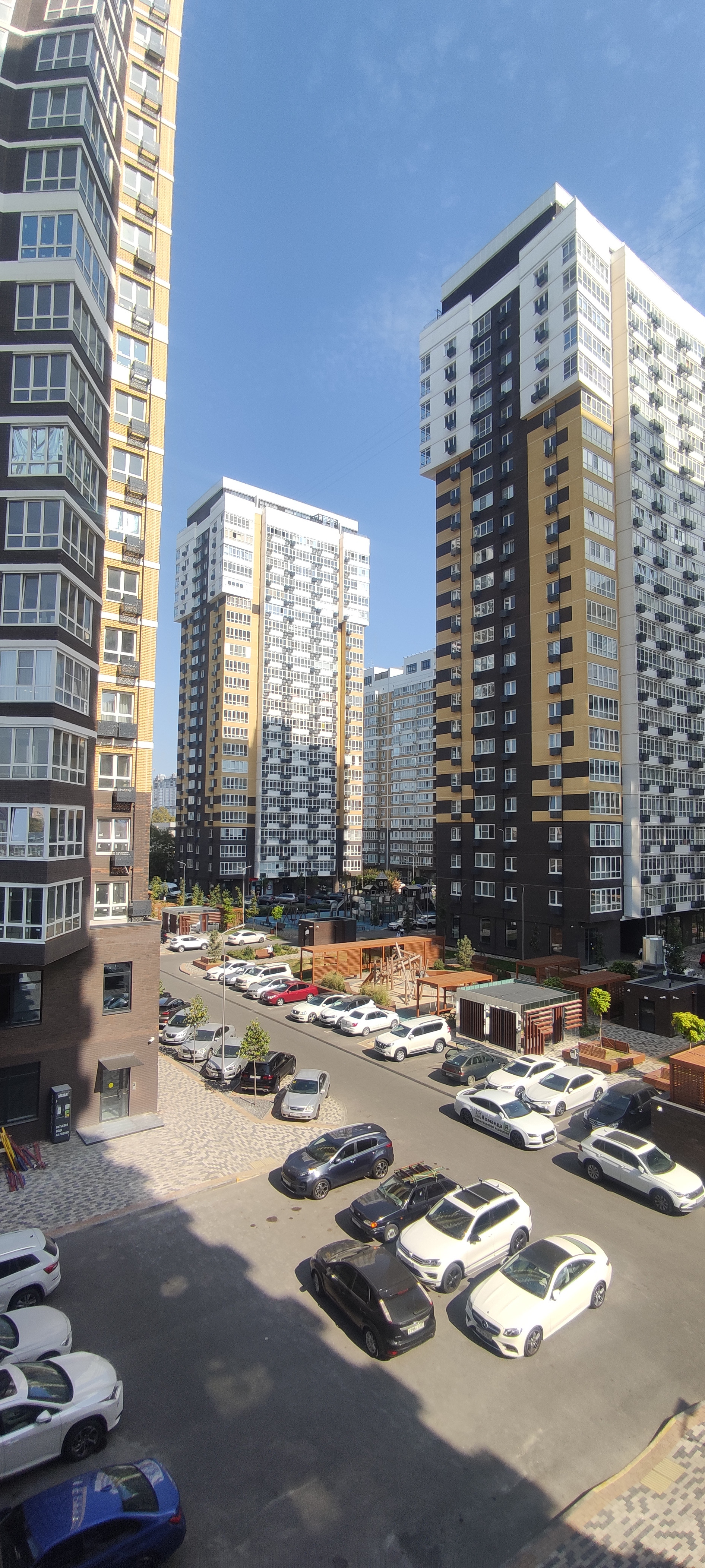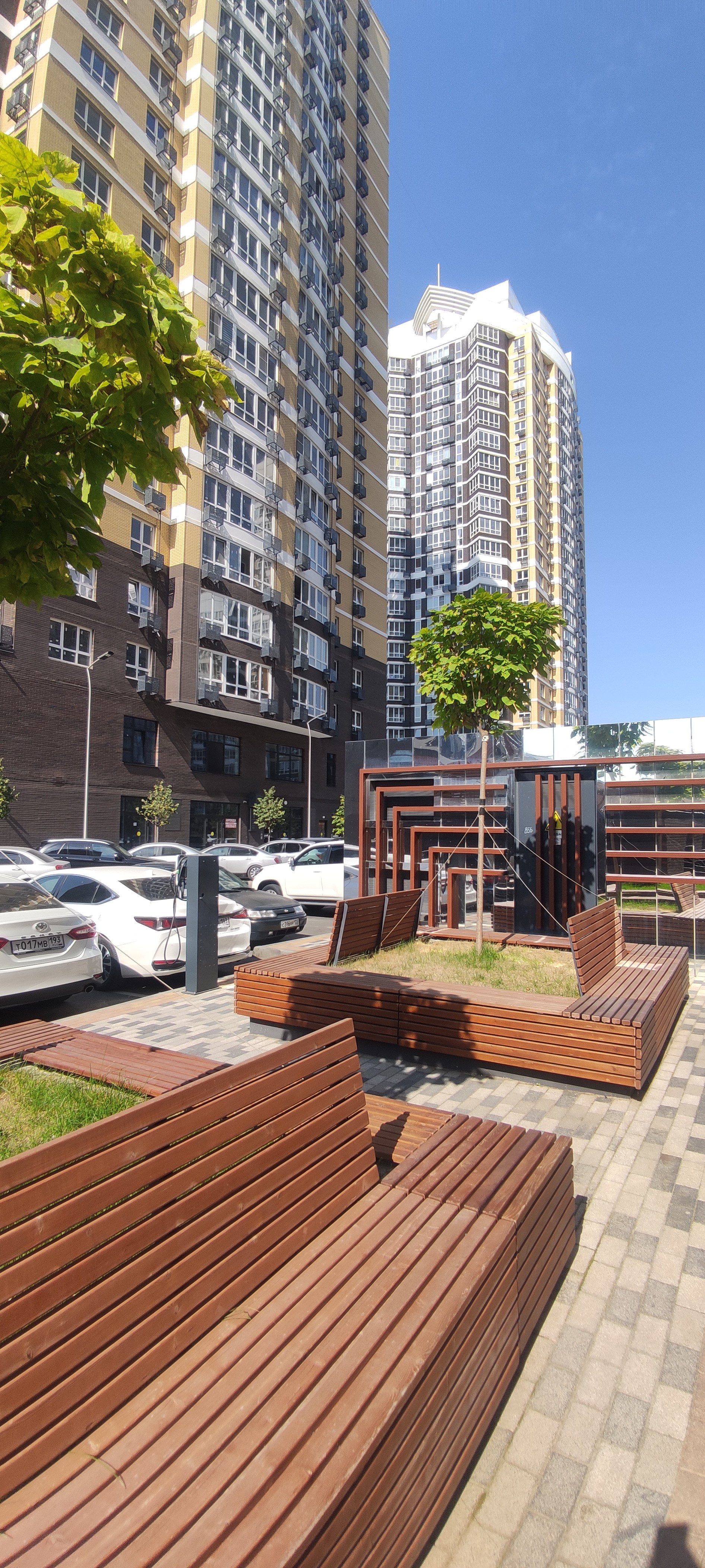 Территория комплекса закрытая, по всему периметру проекта расположены видеокамеры. На  этажах находятся коммерческие помещения, в которых разместилось 25 видов услуг. На придомовой территории спроектированы детские и спортивные площадки. Во дворе проведено озеленение. Для автовладельцев предусмотрен подземный паркинг.