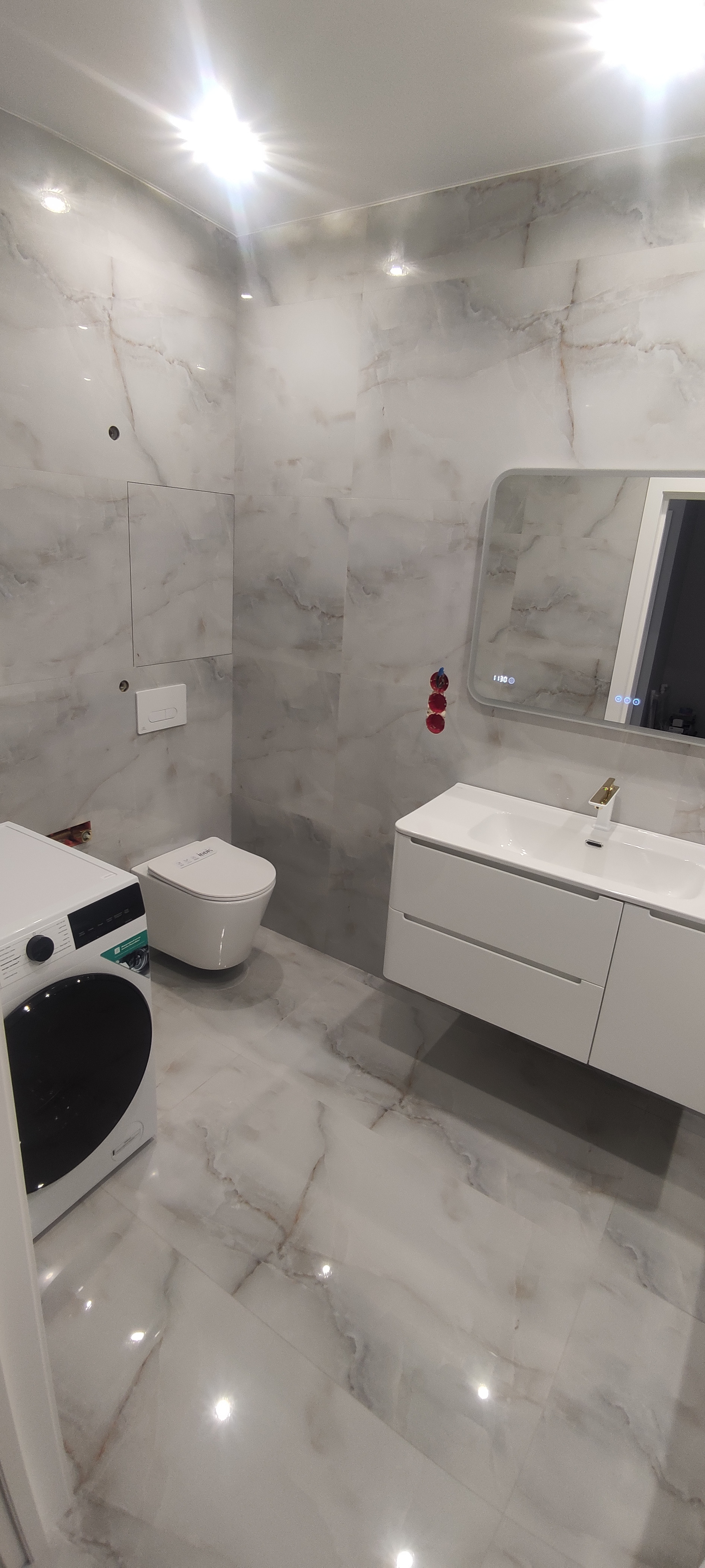 В ванной:  Сантехника вся Lemark цвет белый/золото последняя коллекция  подвесной Встроенный унитаз IDISS с встроенной инсталляцией /раковина с подвесной тумбой /Стиральная машина с сушкой Установлены фильтры на горячую и холодную воду