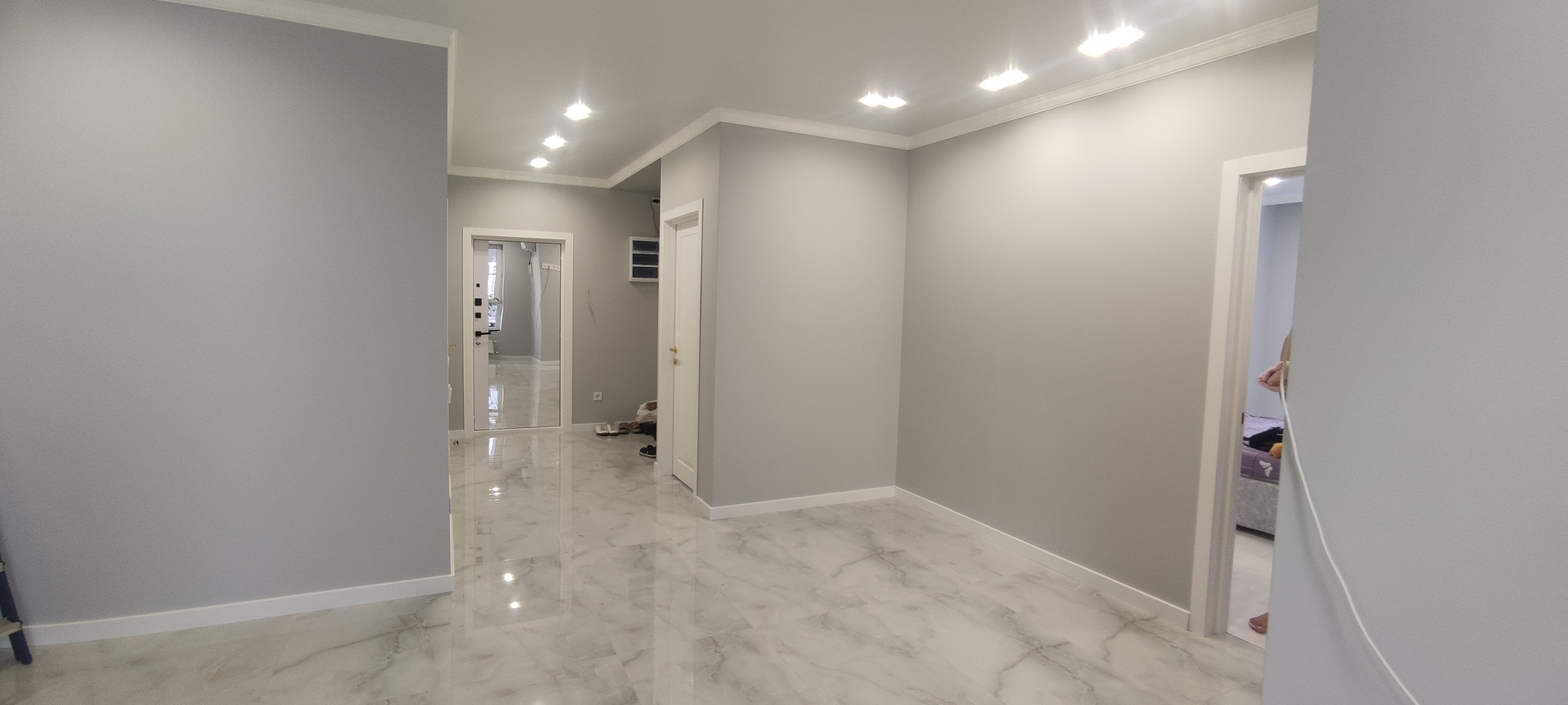 На стенах выполнена качественная штукатурка с применением стеклохолста , краска  Caparol 7 pro,  электрический теплый пол в каждой комнате