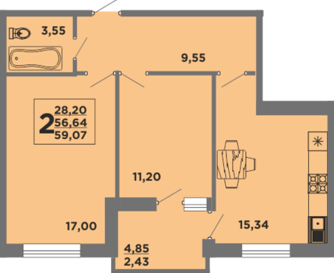 Общая площадь 56.3 м2