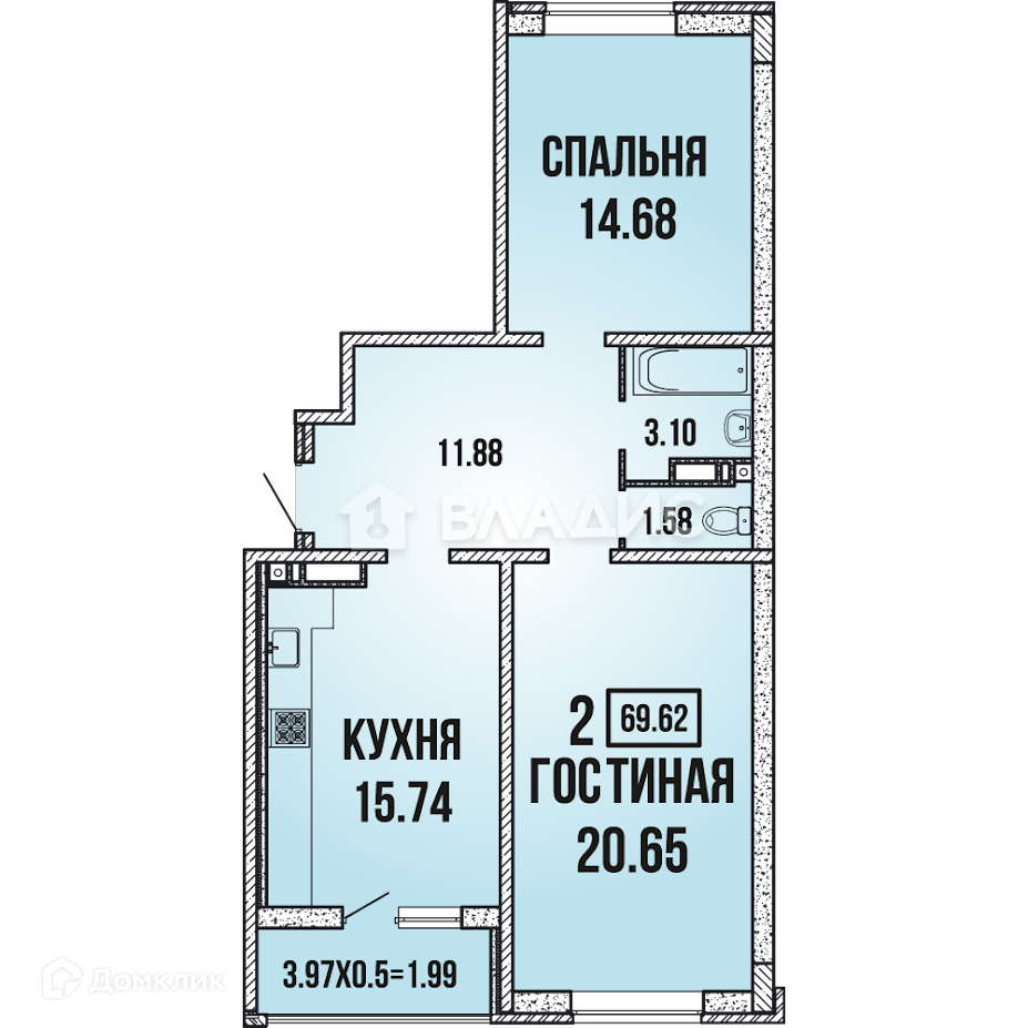 Общая площадь 69.6 м2