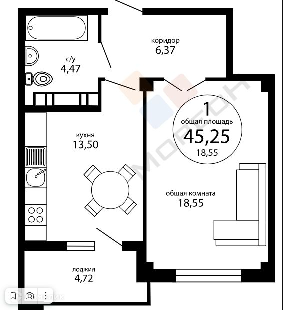 Общая площадь 44.6 м2