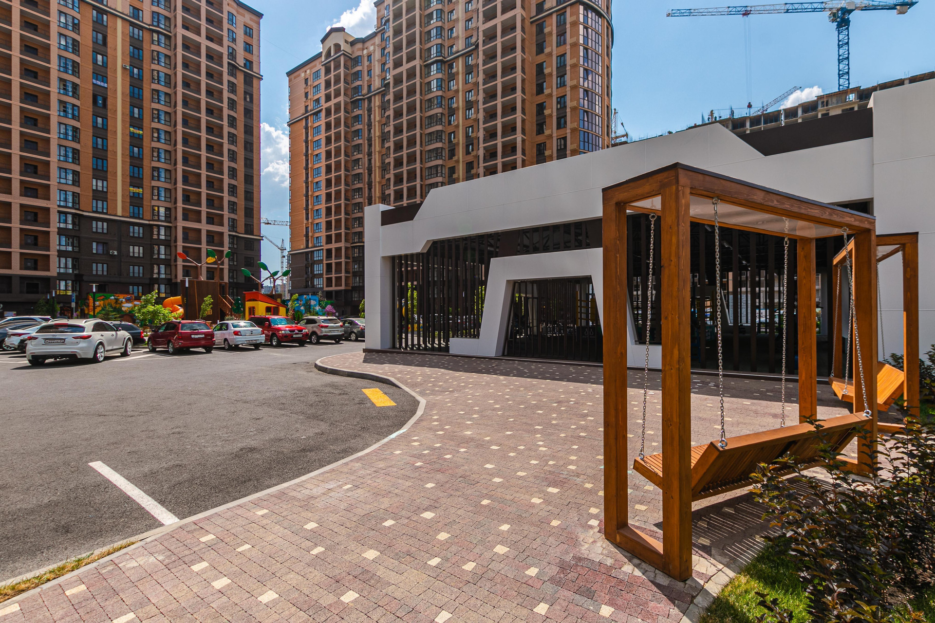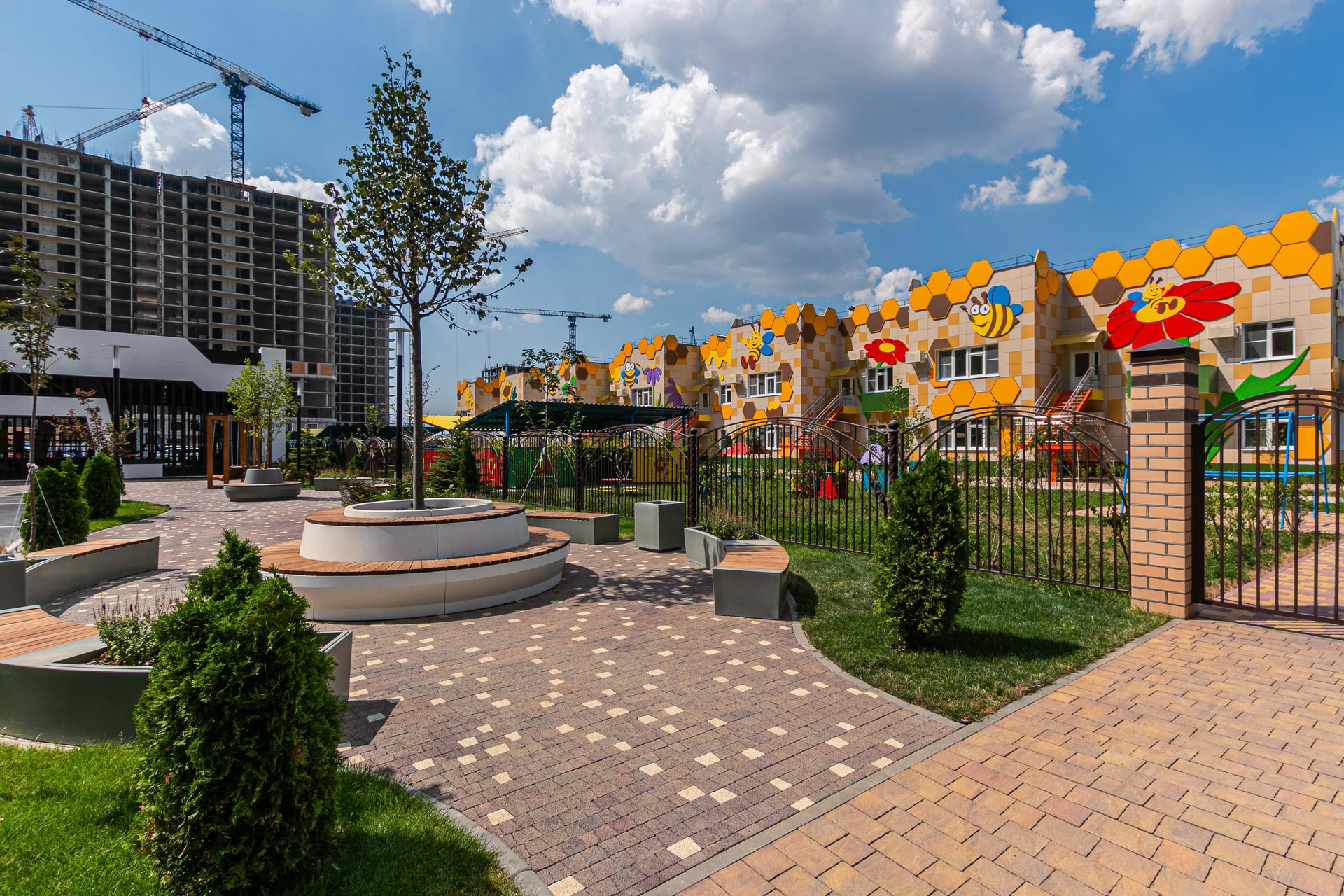 На территории будет три детских сада и школа, рядом "Леруа Мерлен" и "Семейный Магнит". Под дворовой территорией есть подземная парковка, также наземная, парки, прогулочные аллеи.