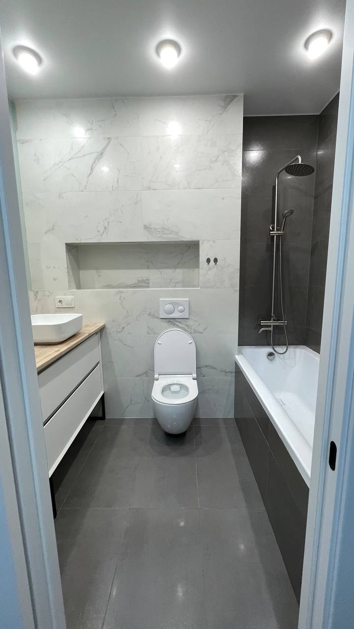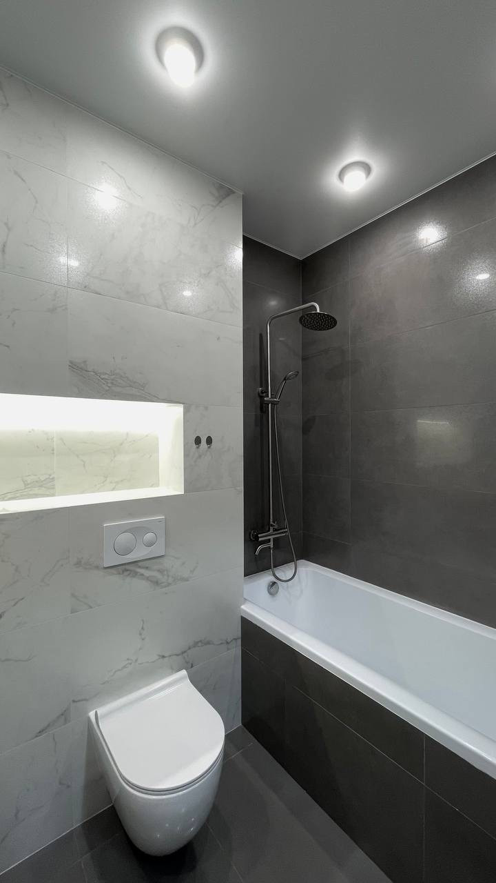 В квартире выполнен современный ремонт с использованием качественных отделочных материалов: на полу — ламинат, на стенах — обои, матовые натяжные потолки со встроенными светильниками, на полу в кухне — керамическая плитка, санузел отделан керамической плиткой, установлена сантехника, межкомнатные двери, молдинги и плинтусы, лоджия застеклена.