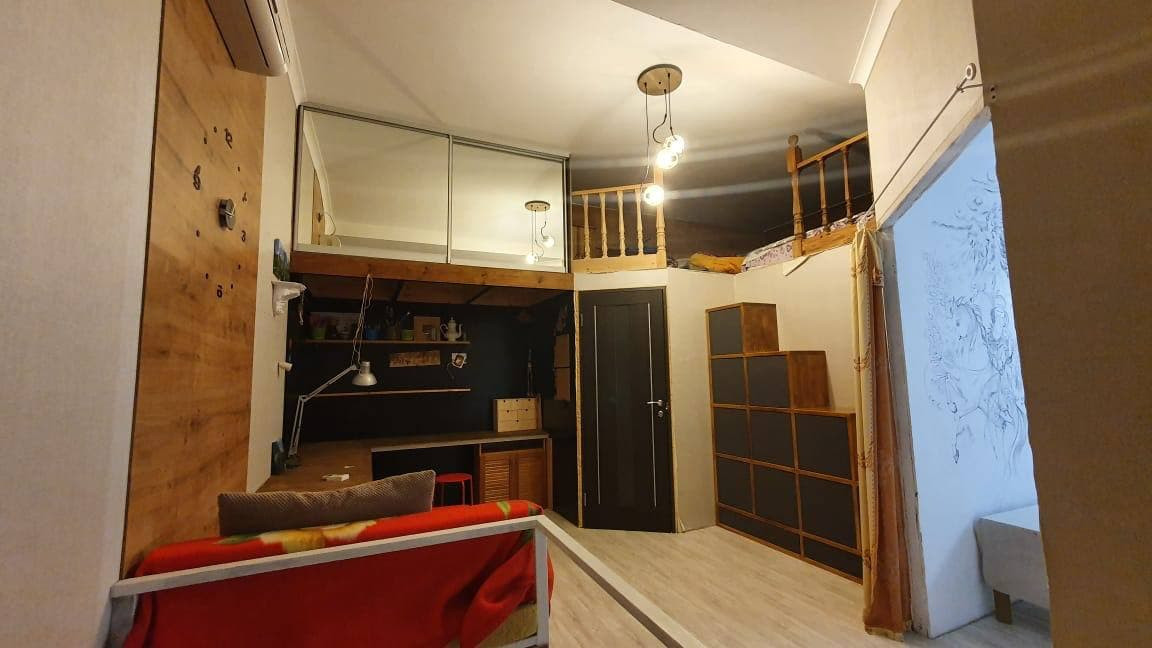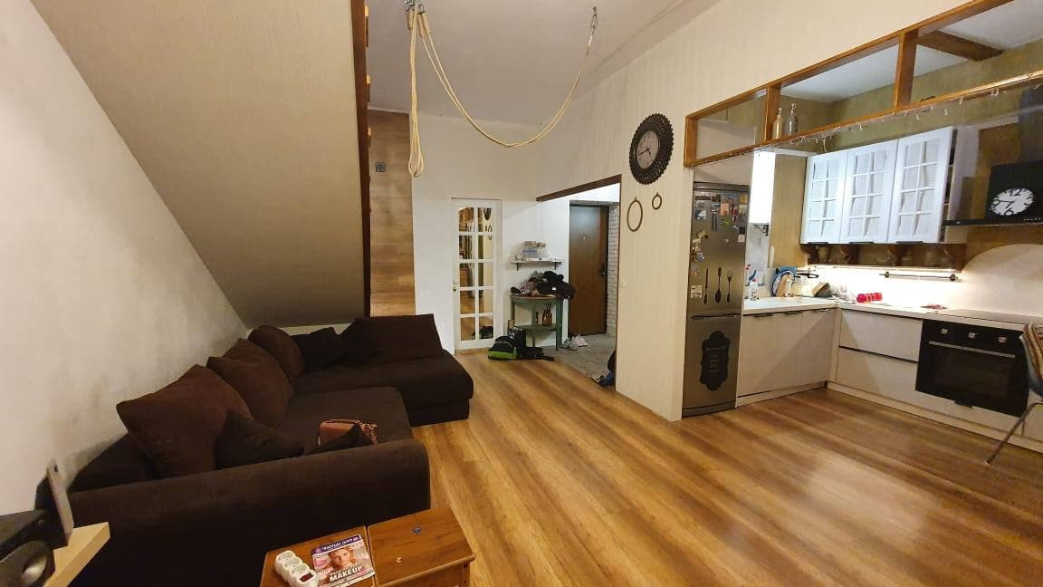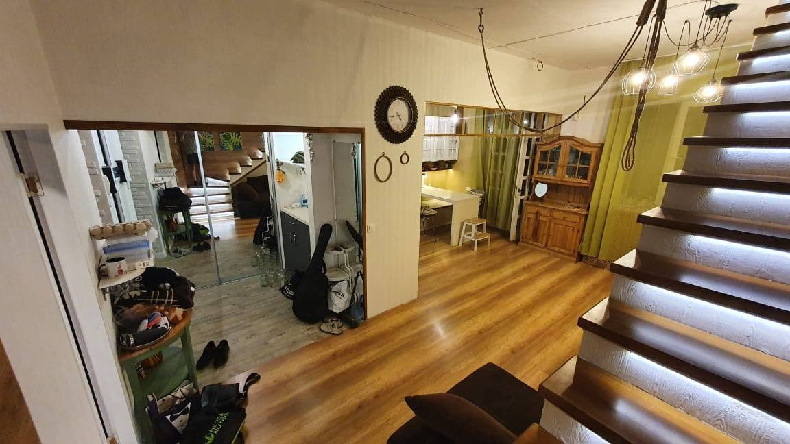 Квартира в два этажа + высокая антресоль со спальными местами. На первом этаже огромная Кухня-гостиная, оборудовано всей техникой.