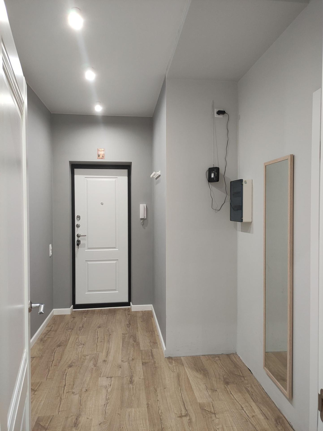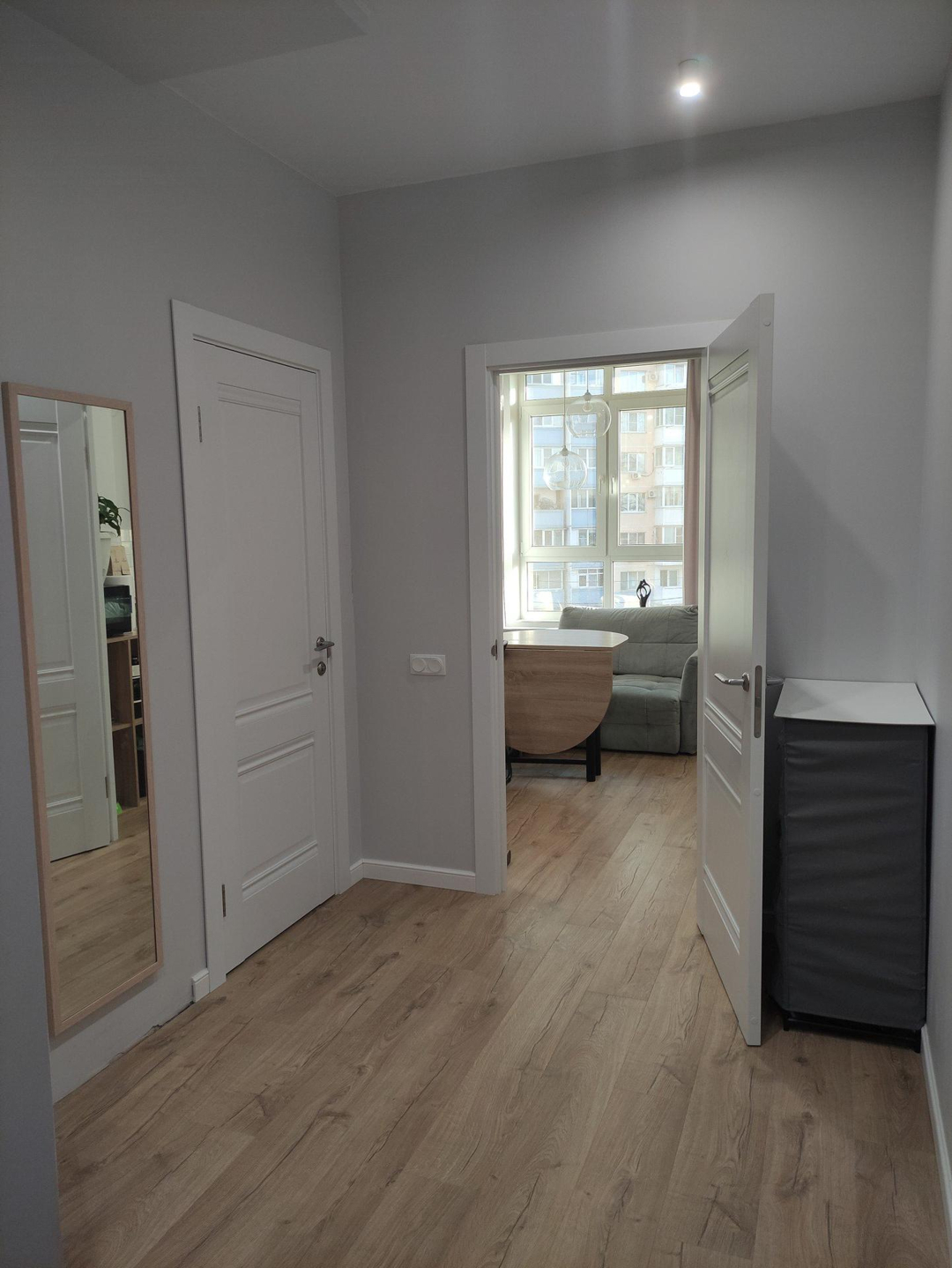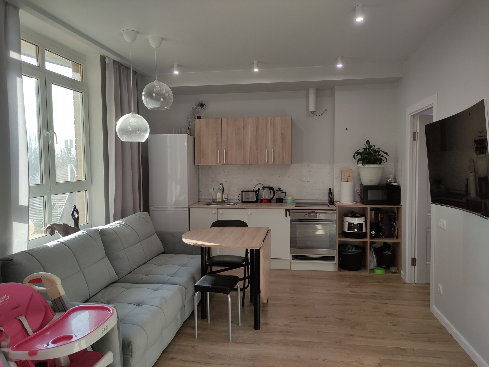 В квартире остаётся кухня с индукционной варочной панелью, столом, табуретами. Кондиционер в кухне-гостиной, частично мебель в спальне.
