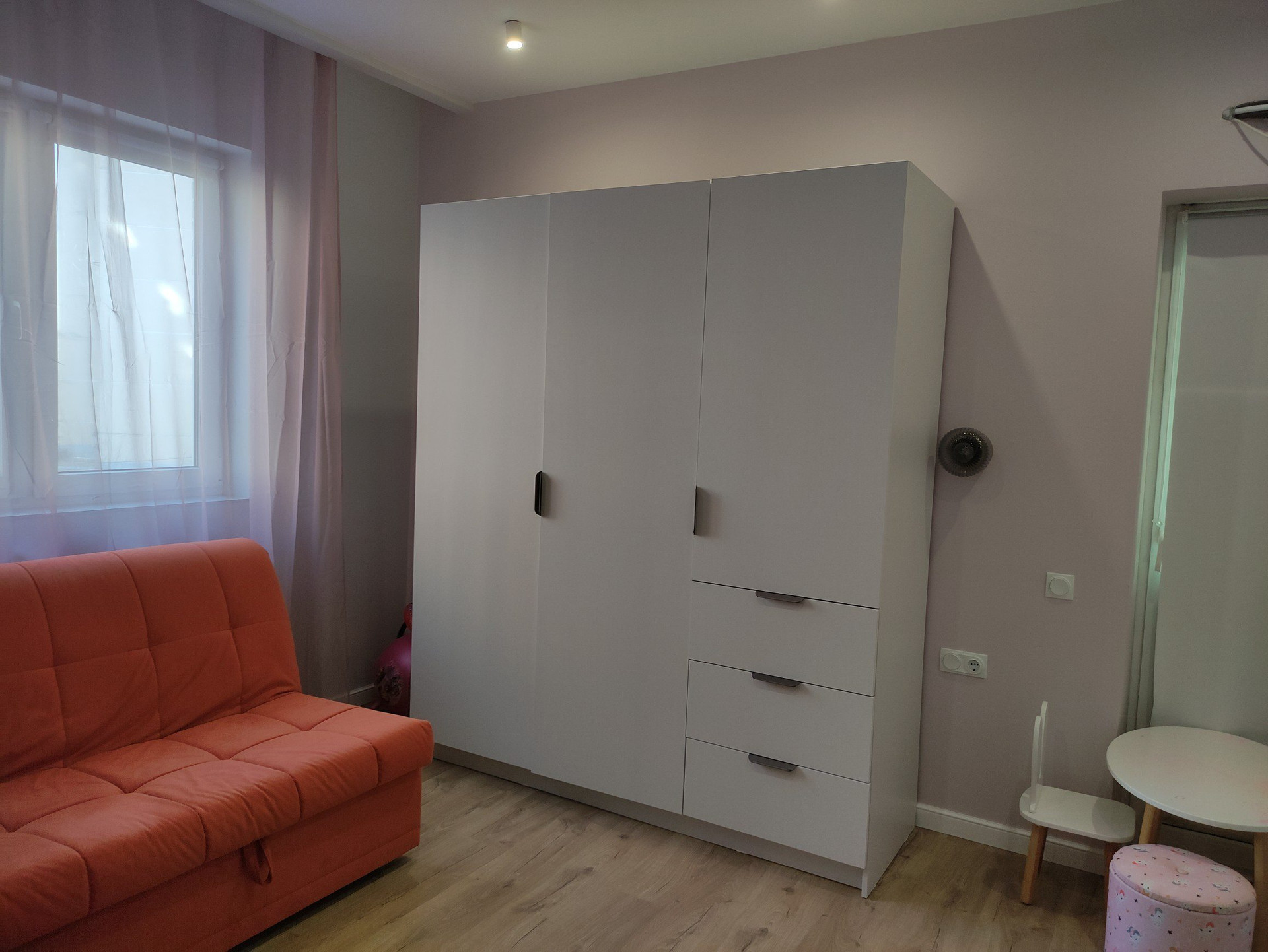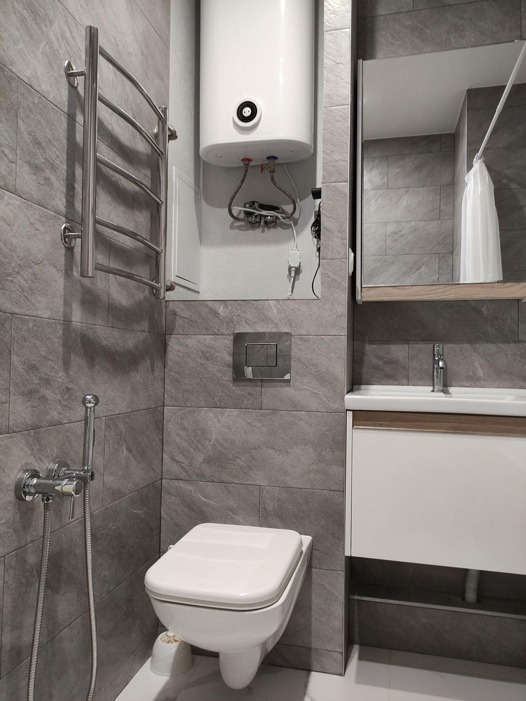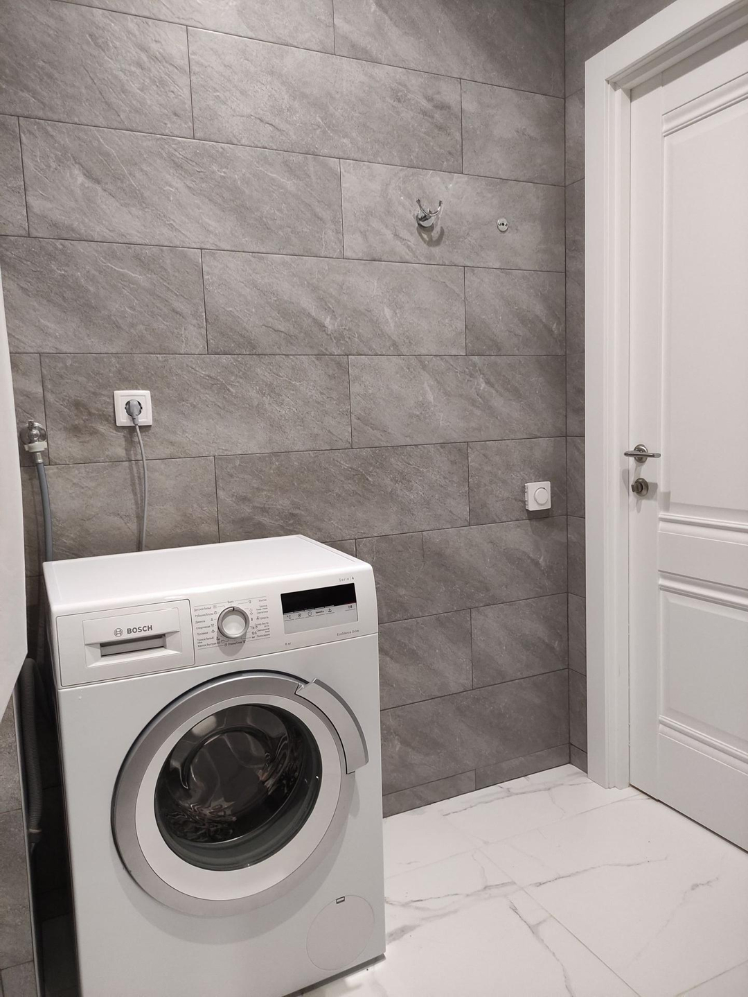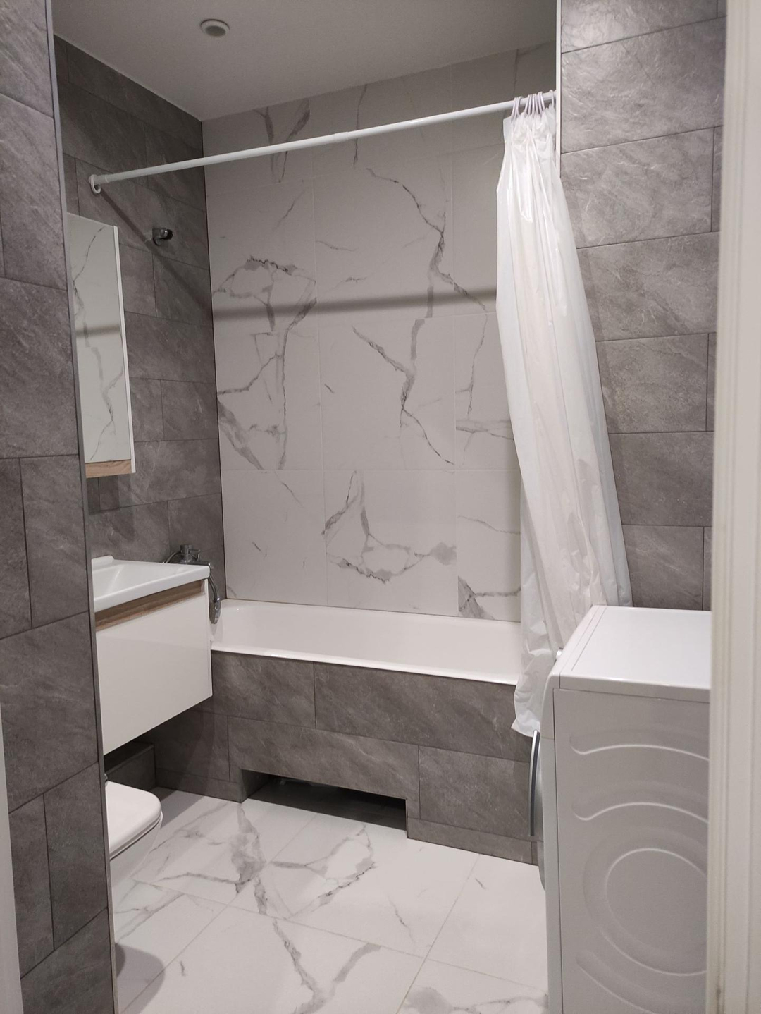 В квартире остаётся кухня с индукционной варочной панелью, столом, табуретами. Кондиционер в кухне-гостиной, частично мебель в спальне.