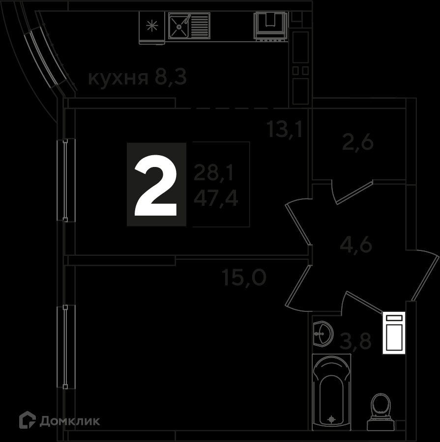 Общая площадь 47.4 м2