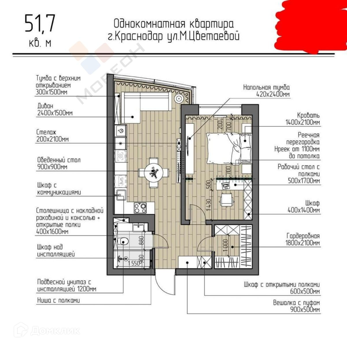 1-комнатная квартира, 43.1 м2, этаж 8 / 16, на продажу в Краснодаре, улица Марины Цветаевой, 3к2