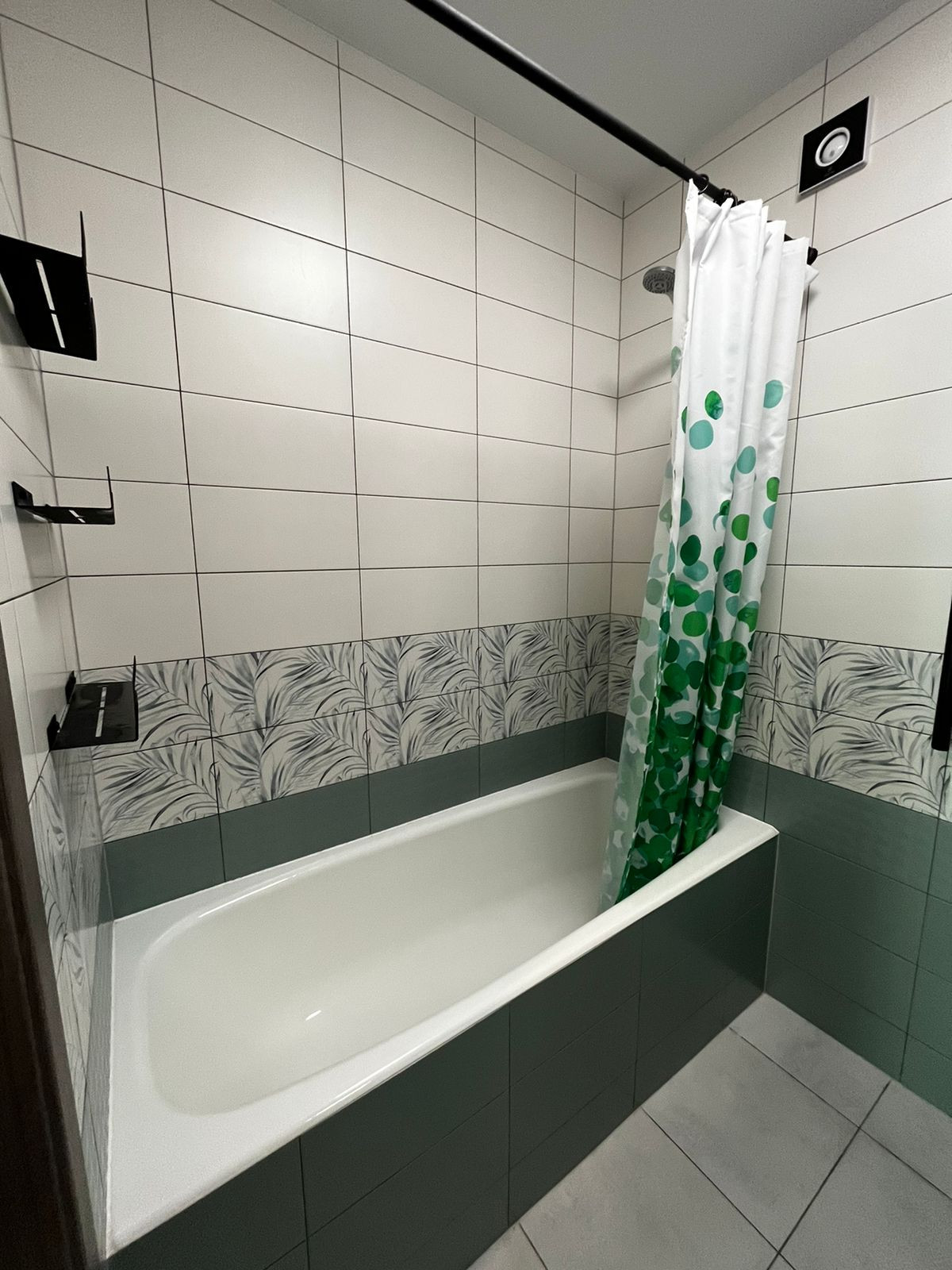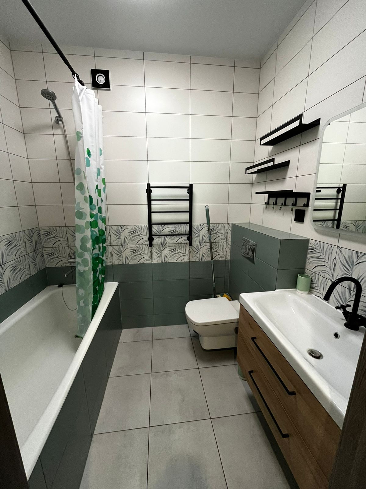 В совмещенном санузле установлены ванная,инсталляция, раковина, подвесная тумба.