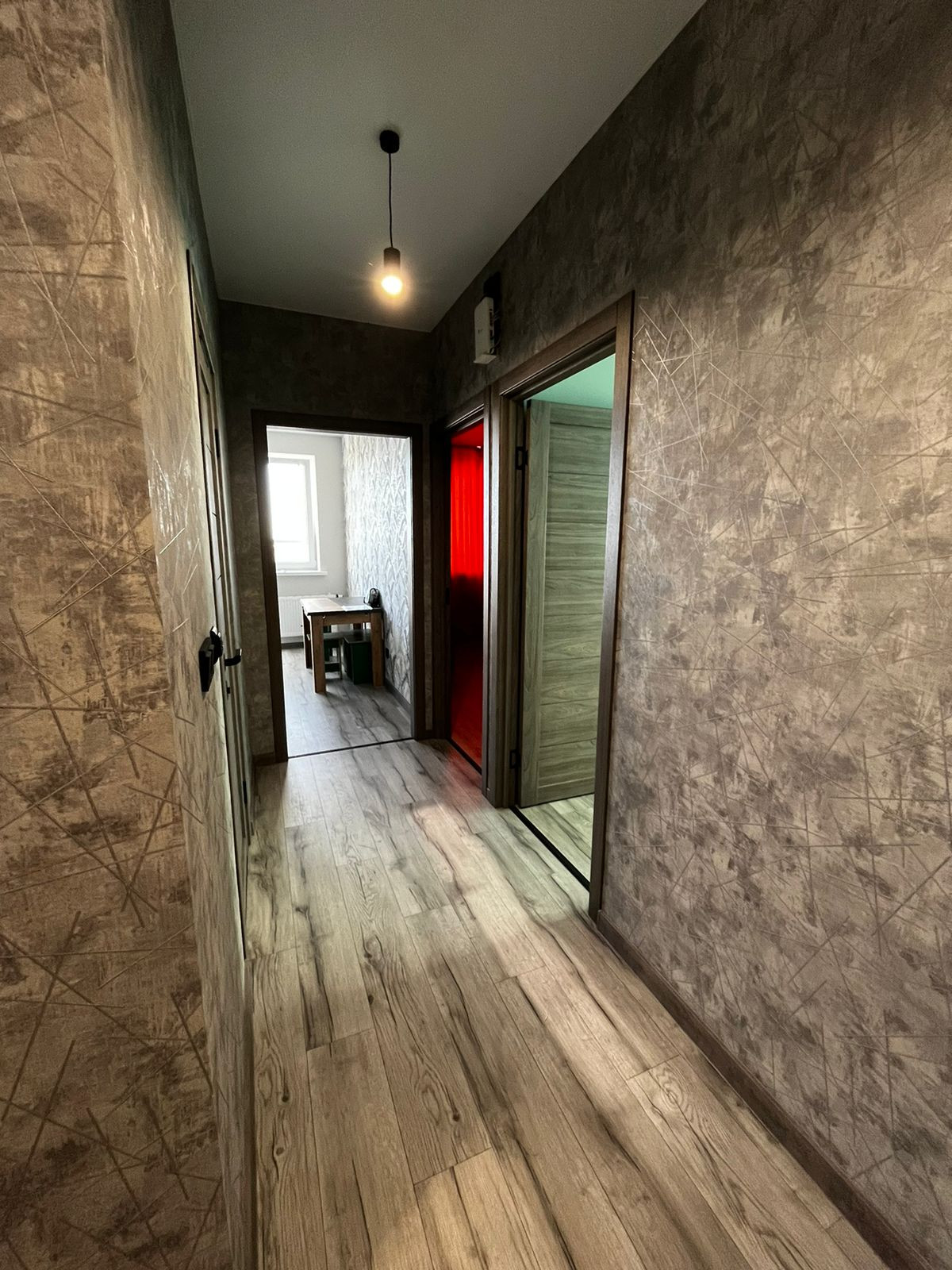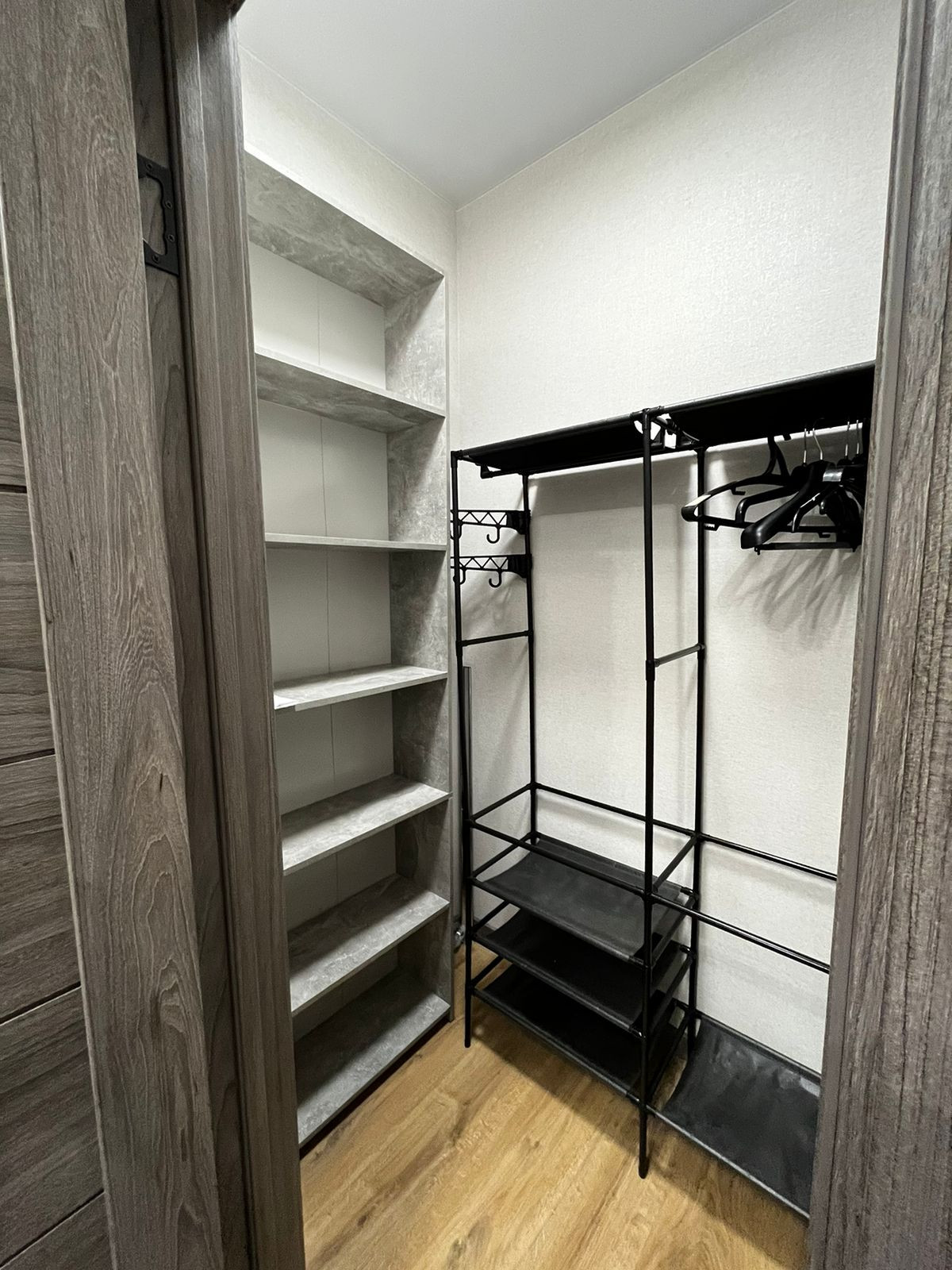 Отдельная гардеробная с местом хранения вещей, большая прихожая и длинный коридор.