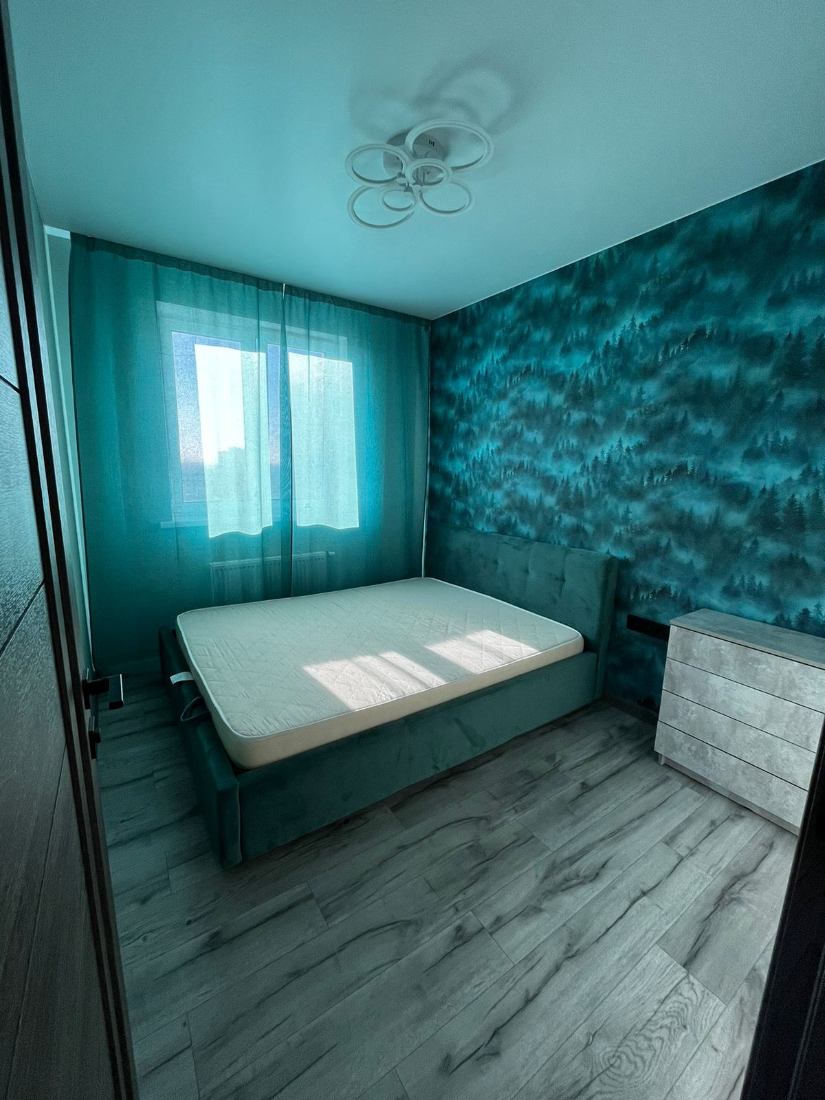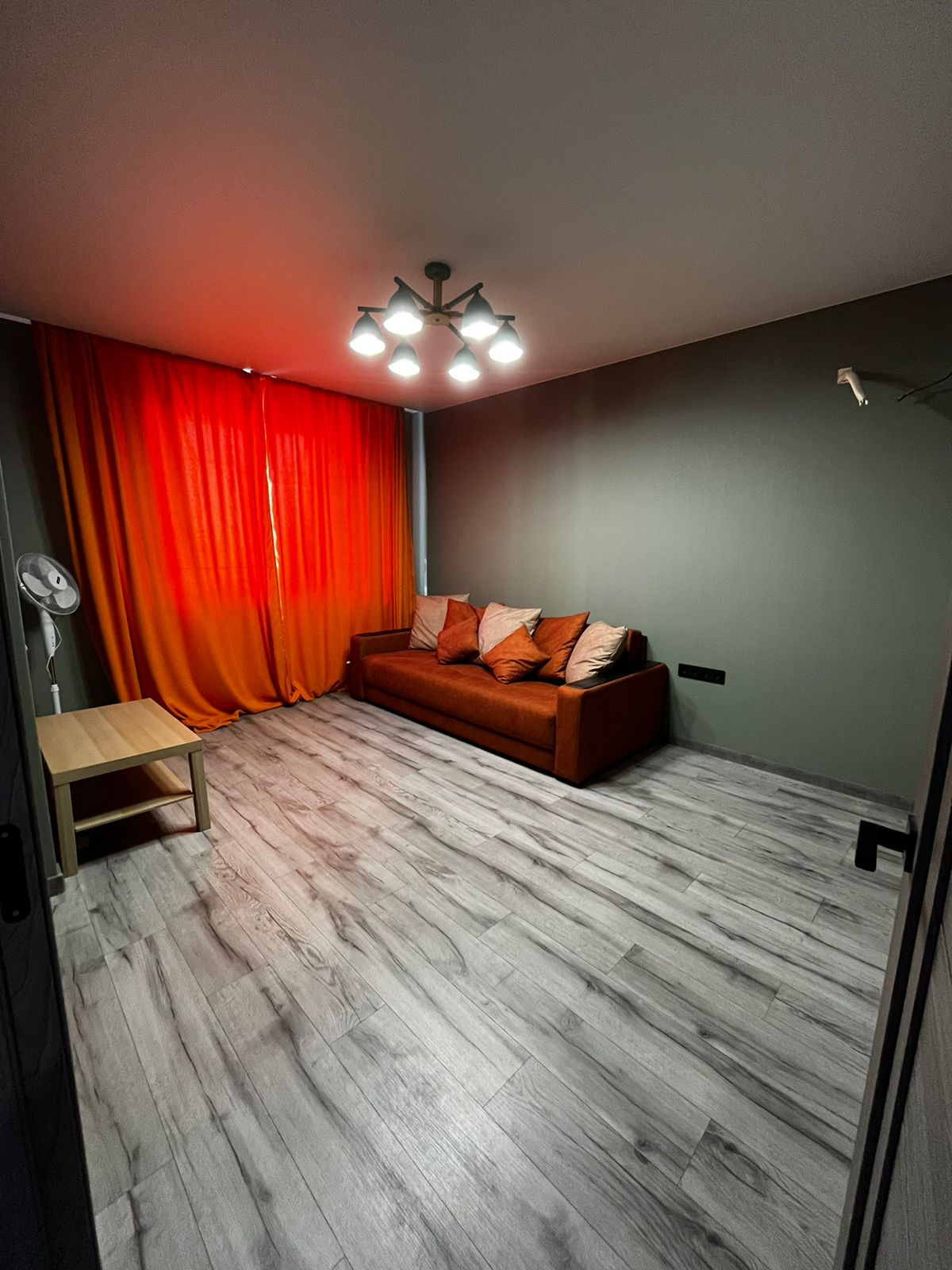 В зале располагается большой диван и чайный стол, шторы. В спальне кровать, шторы. Натяжные потолки. Свет на балконе. В спальне и на кухне люстры с несколькими режимами переключения света.