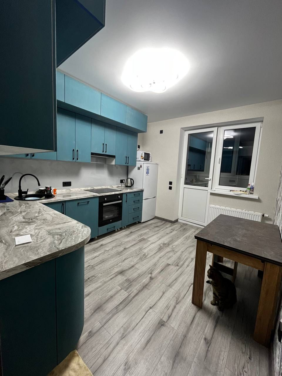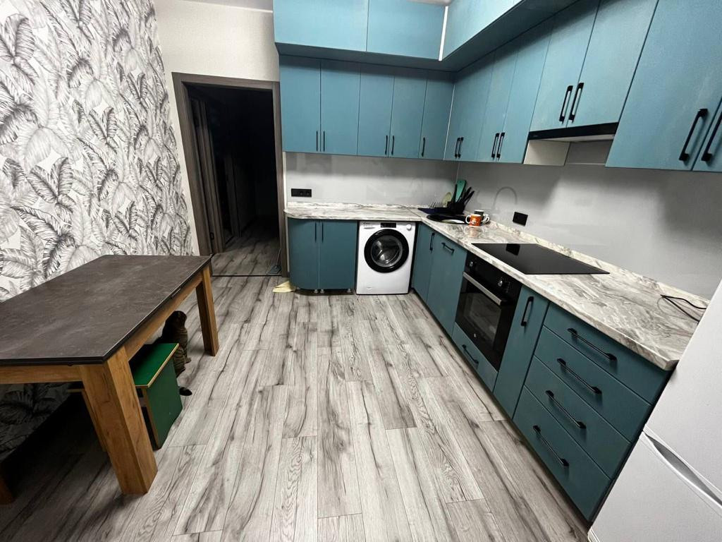 На кухне бытовая техника: холодильник, индукционная плита, вытяжка, духовой шкаф, стиральная машинка, посудомоечная машинка, водонагреватель/проточный.