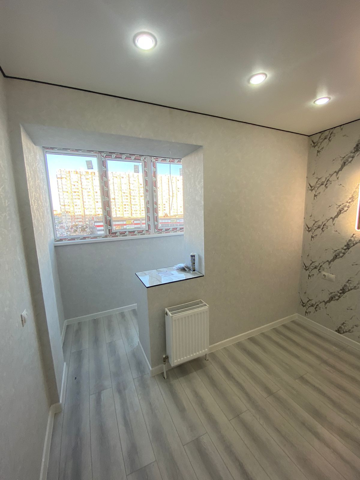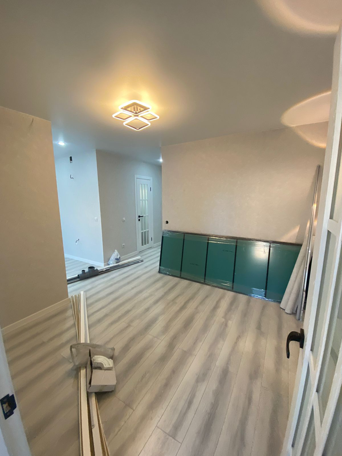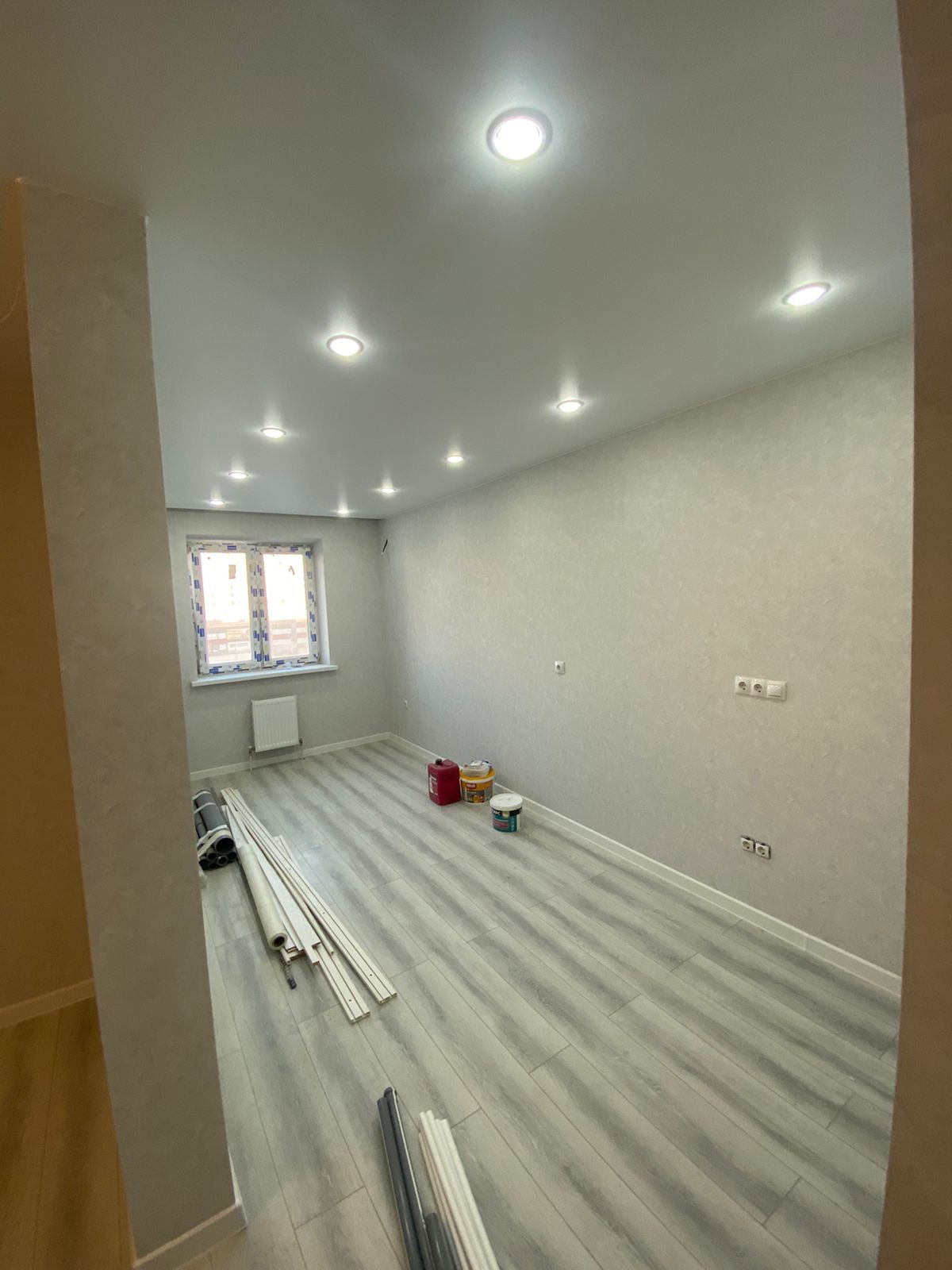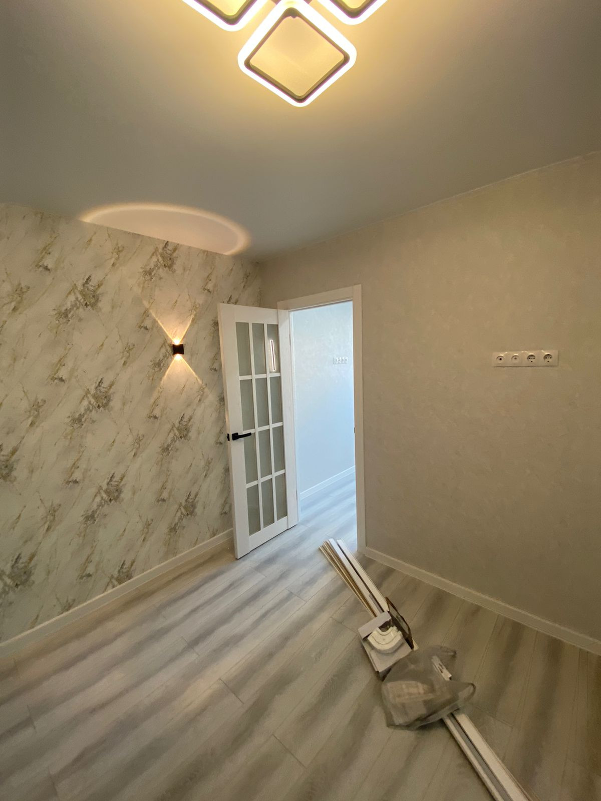 В квартире выполнен свежий ремонт с использованием качественных отделочных материалов: на полу —ламинат, стены — обои, натяжные потолки, люстры, светильники, выключатели и розетки, установлена сантехника, смесители, ванна, межкомнатные двери.