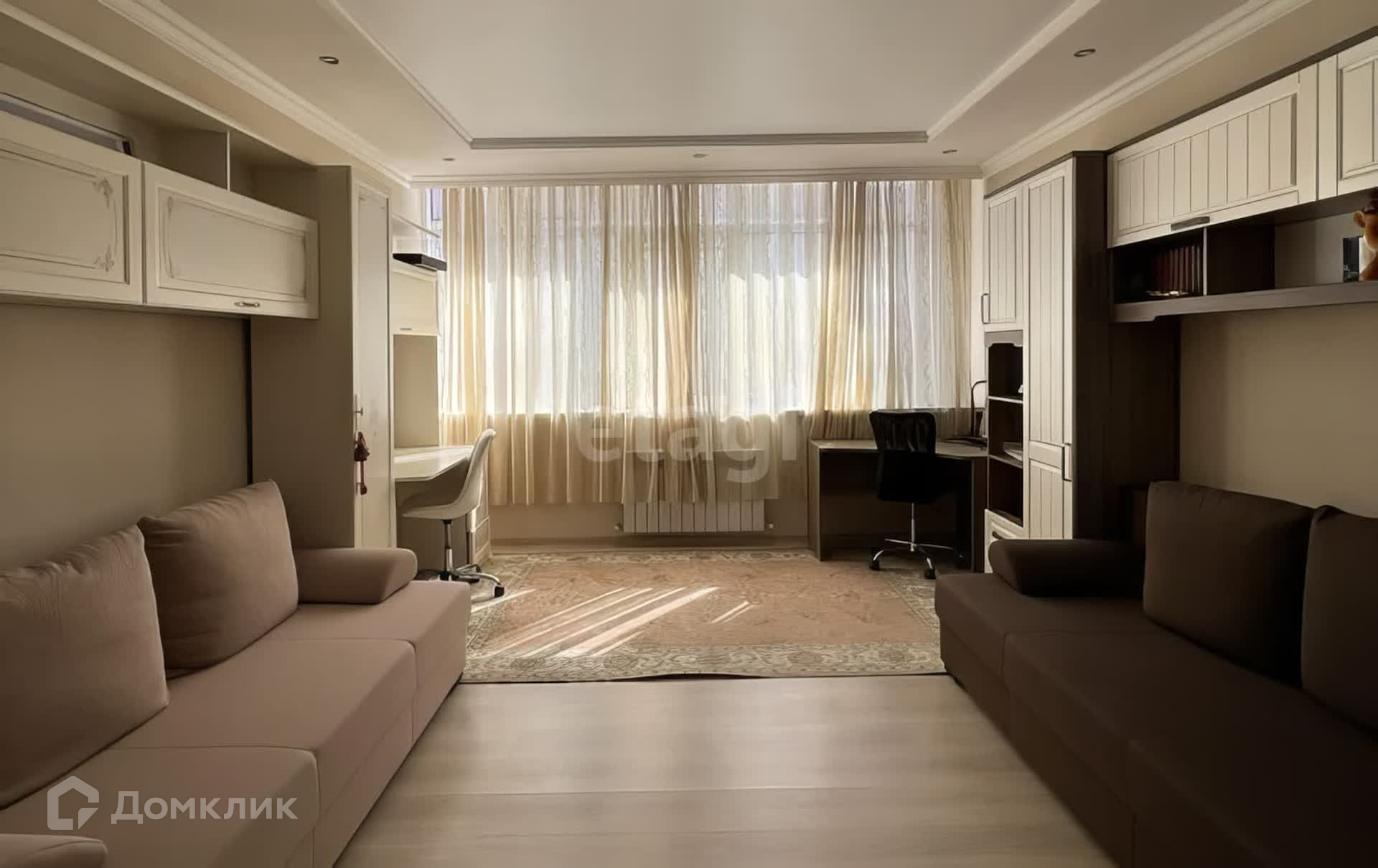 Квартира расположена на среднем этаже. Планировка удобная: просторная кухня -гостиная, и две спальни. Есть гардеробная. Площадь в объявлении указана без учета двух остекленных и утепленных лоджий, где можно оборудовать кабинет.