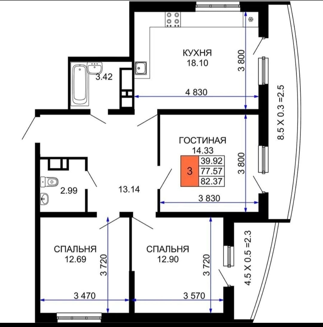 3-комнатная квартира, 82 м2, этаж 11 / 25, на продажу в Краснодаре, улица Петра Метальникова, 38