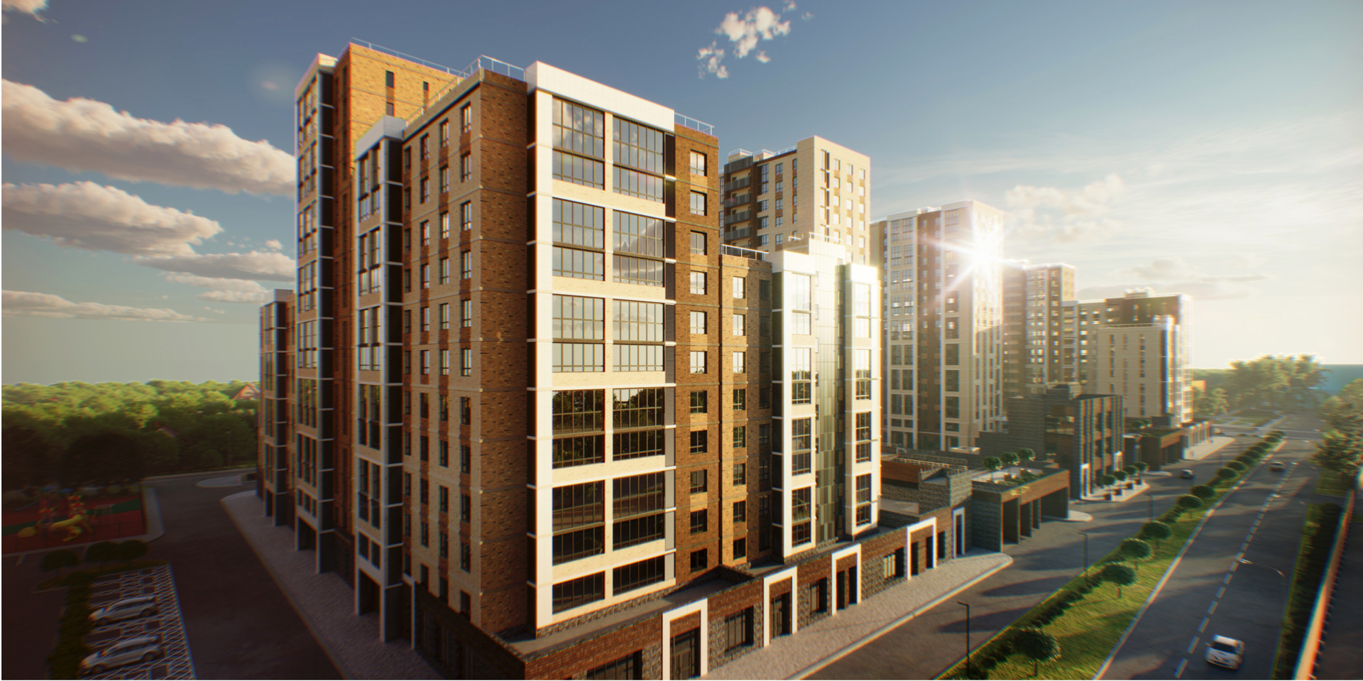 Комплекс с закрытой территорией, Два литера с переменной этажностью каждый подъезд (по 8 подъездов каждый литер). Есть подземный паркинг с кладовыми, коммерческие помещения, своя школа и детский сад на территории.