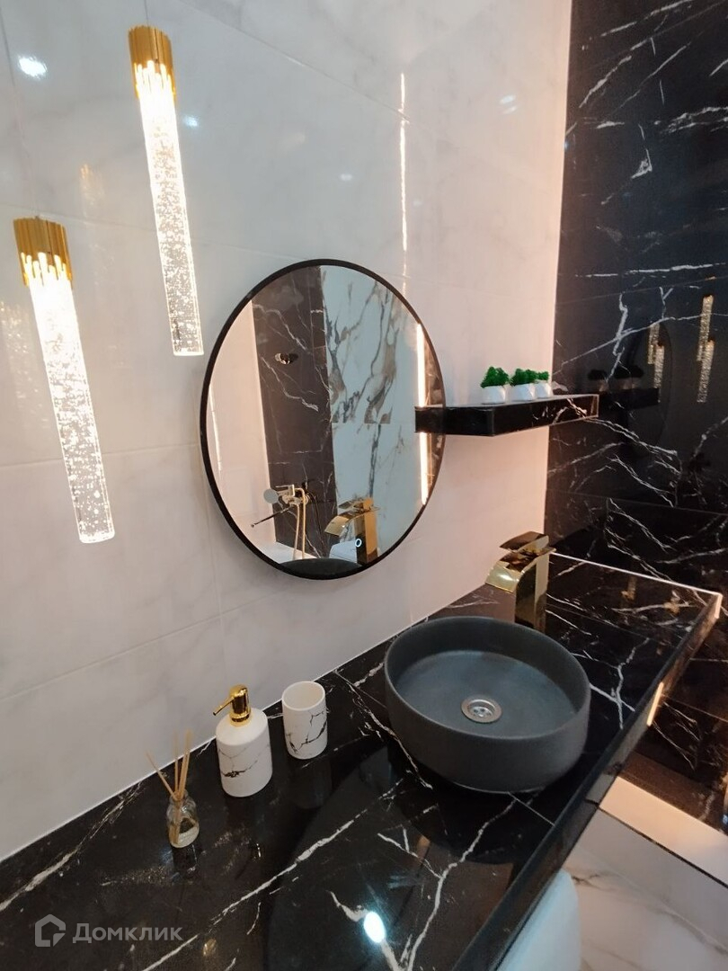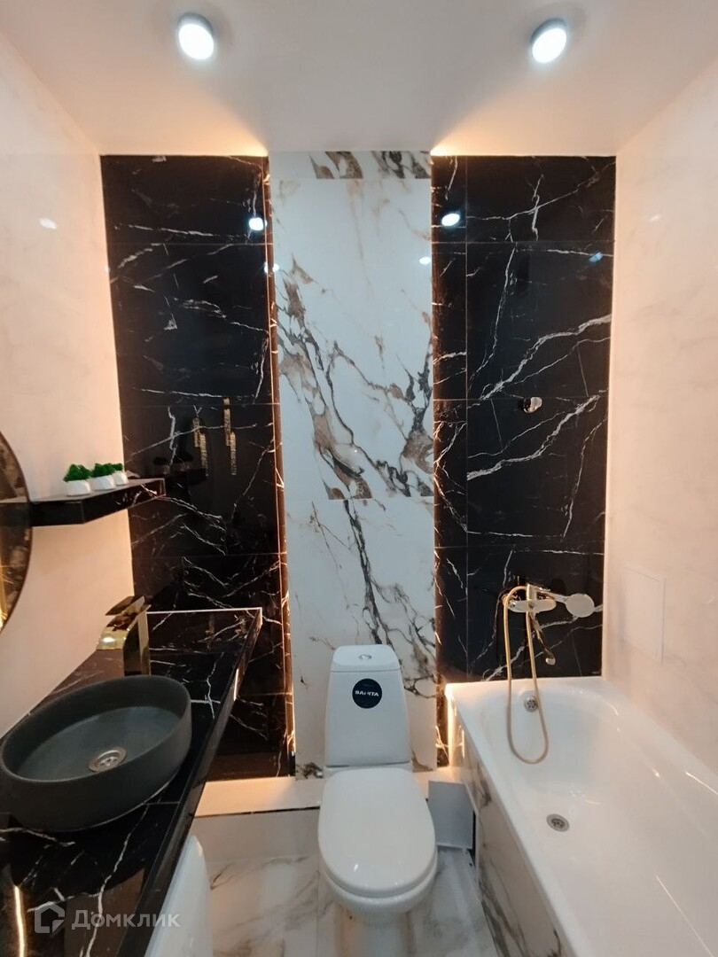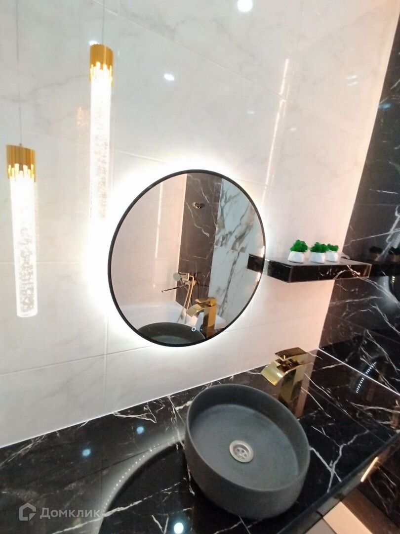 В ванной керамогранит, элюминация и сантехника.