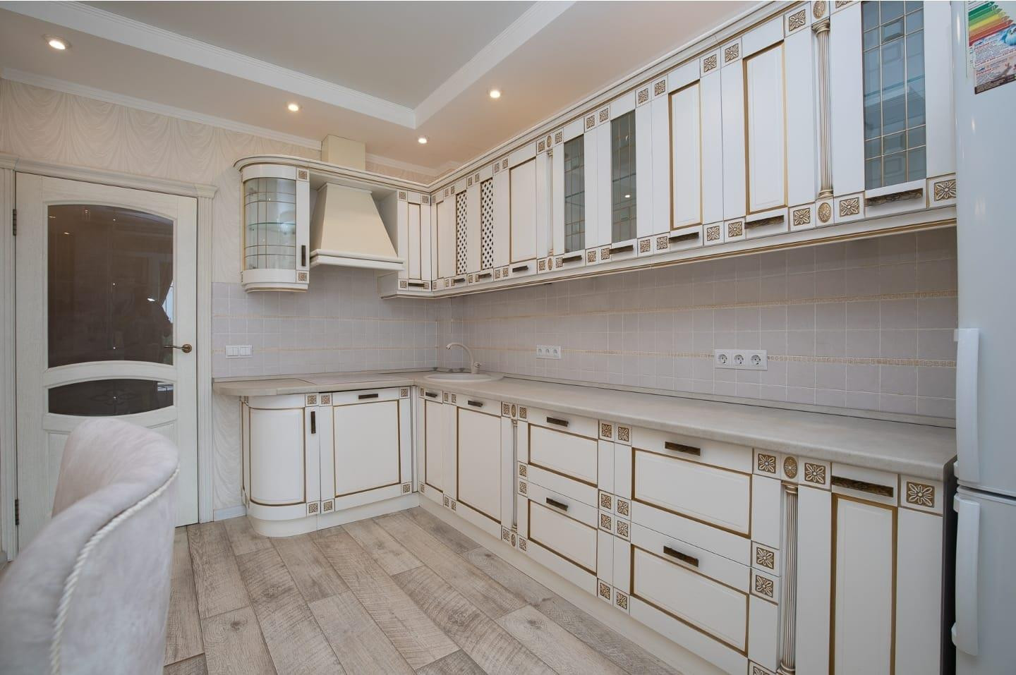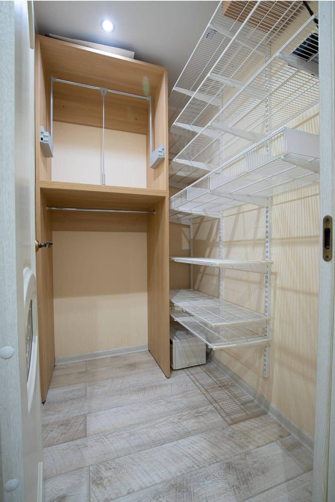 Вся мебель на заказ, дорогая встроенная техника Candy, итальянская сантехника, двойная фильтрация воды, сплит в каждой комнате, гардеробная оборудована системой полок и карнизов для вешалок с лифтовым спуском, заменена вся электрика на медную.