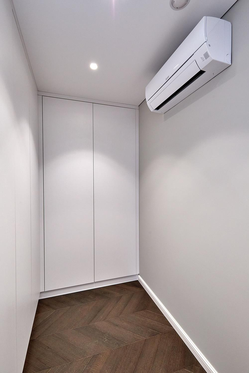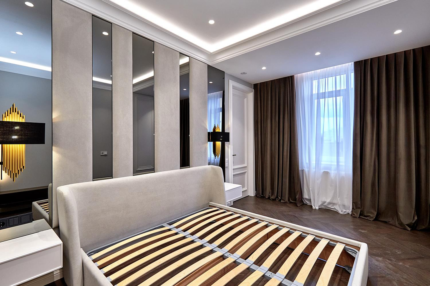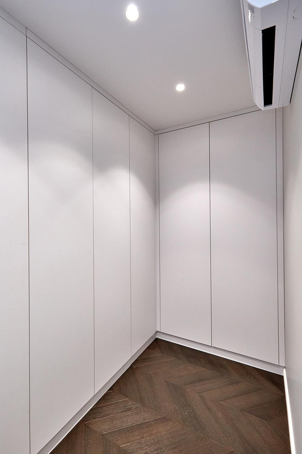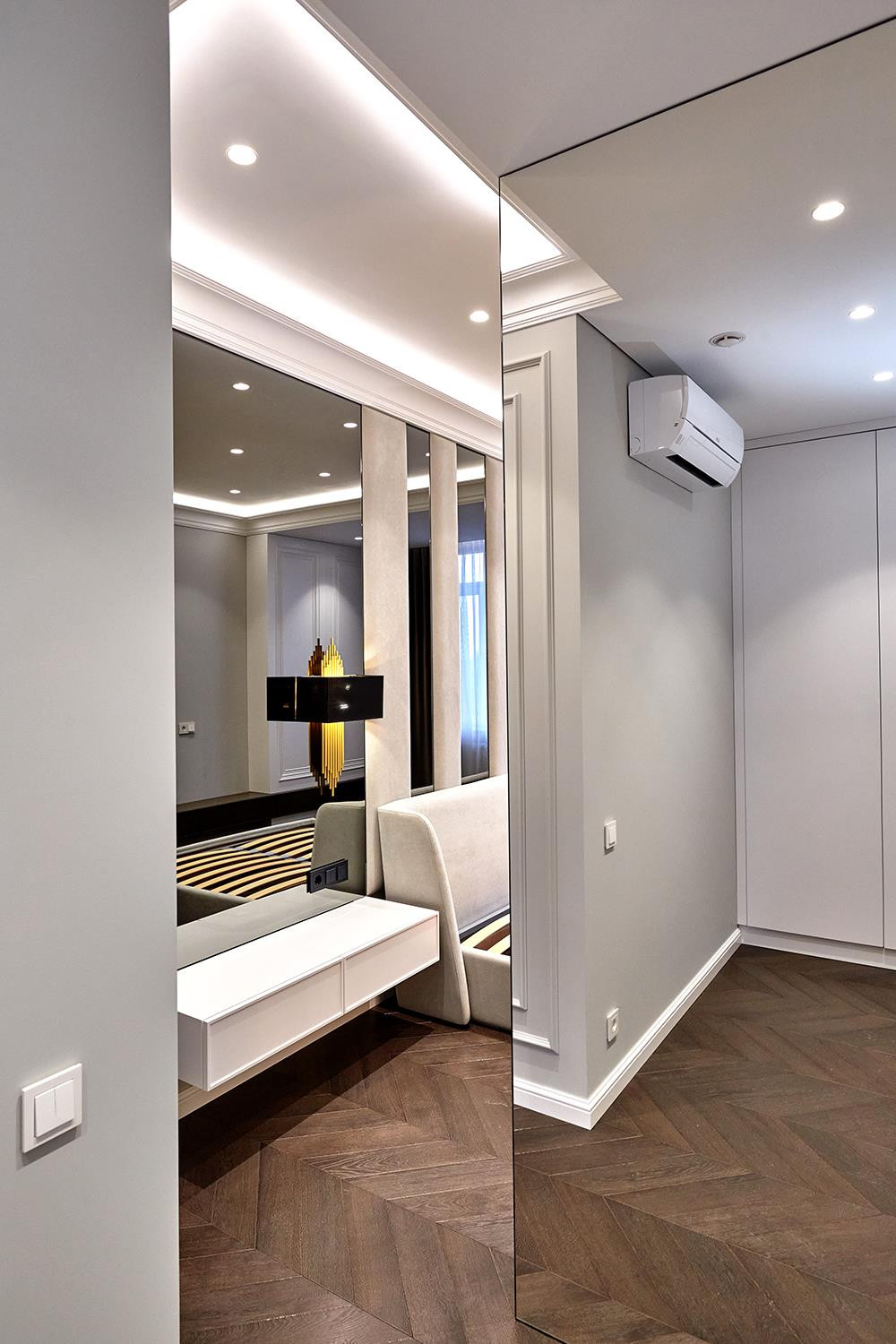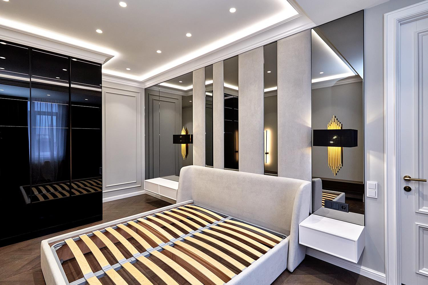 Спальня совмещена с гардеробной комнатой, с продуманной до мелочей системой хранения, так же есть высокая витрина с подсветкой для хранения сумок и аксессуаров. Кровать с ортопедическим основанием, размер спального места 180/200