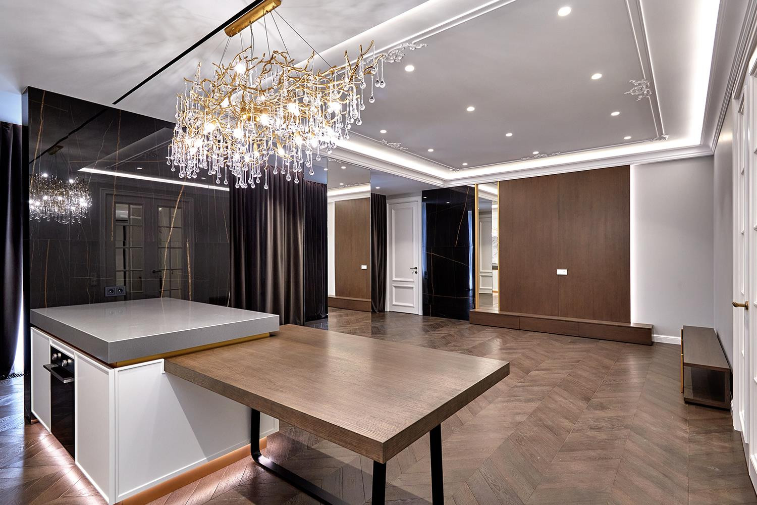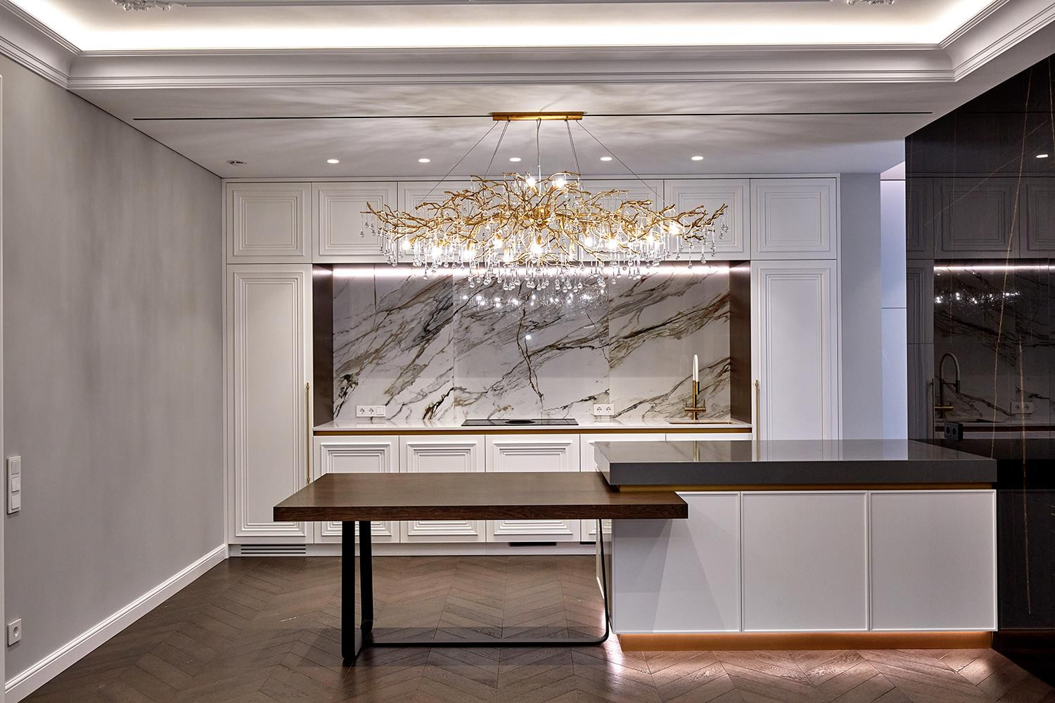 Кухня и гостиная объединены в общую зону, кухня изготовлена по индивидуальному проекту, полностью укомплектована техникой шведской фабрики ASCO (холодильник и духовой шкаф с функцией пароконвектомата) варочная панель со встроенной вытяжкой ELICA Nikolatesla