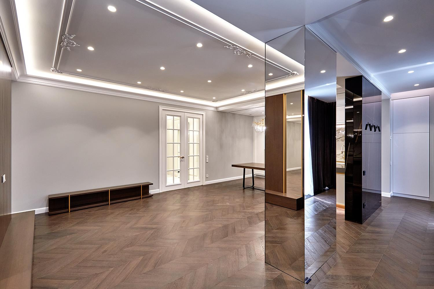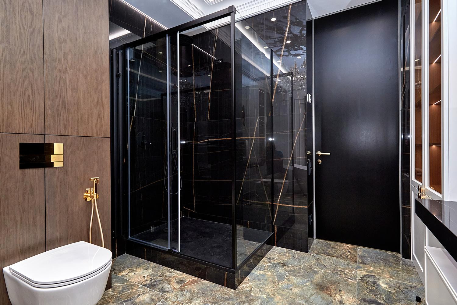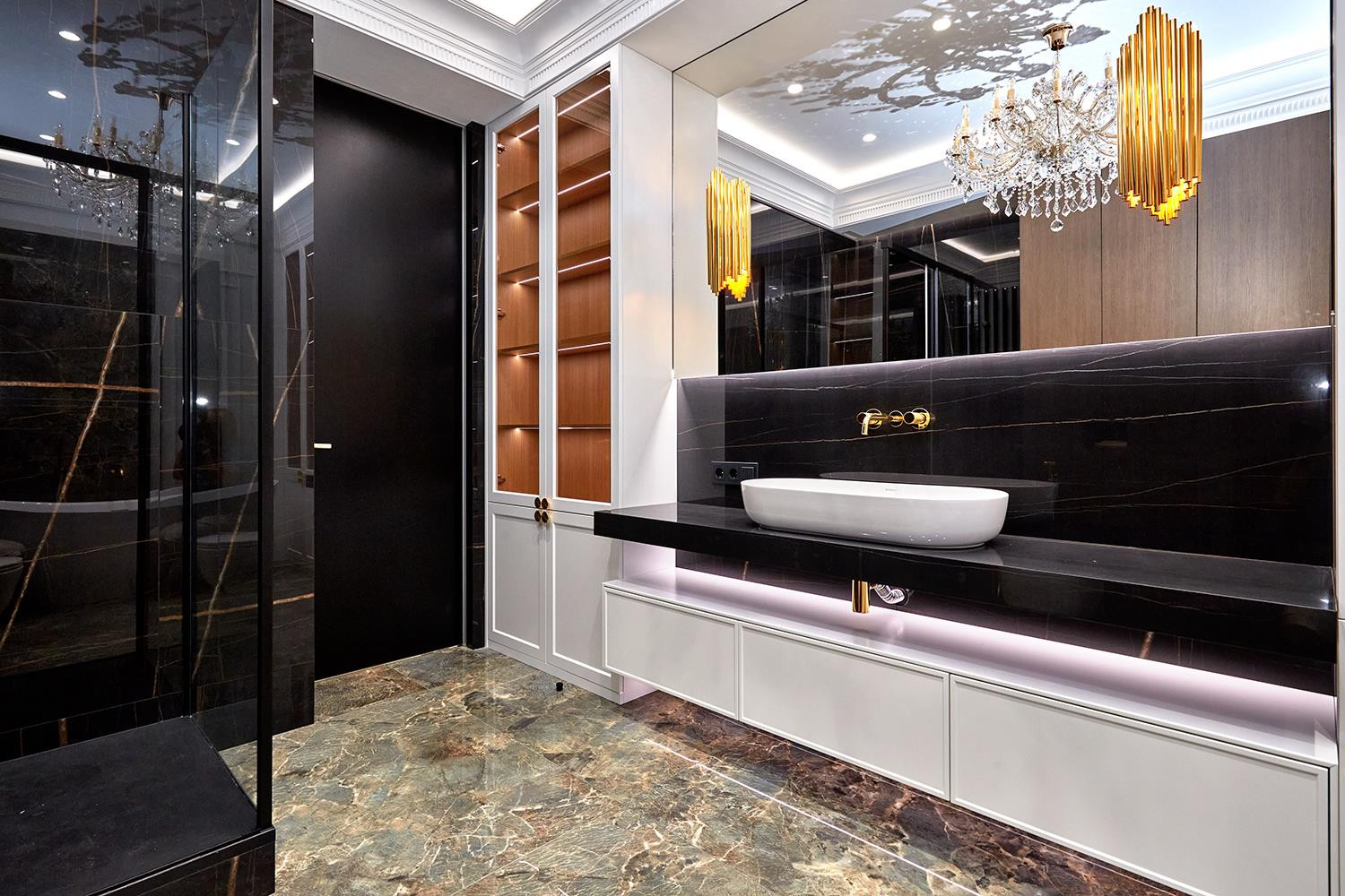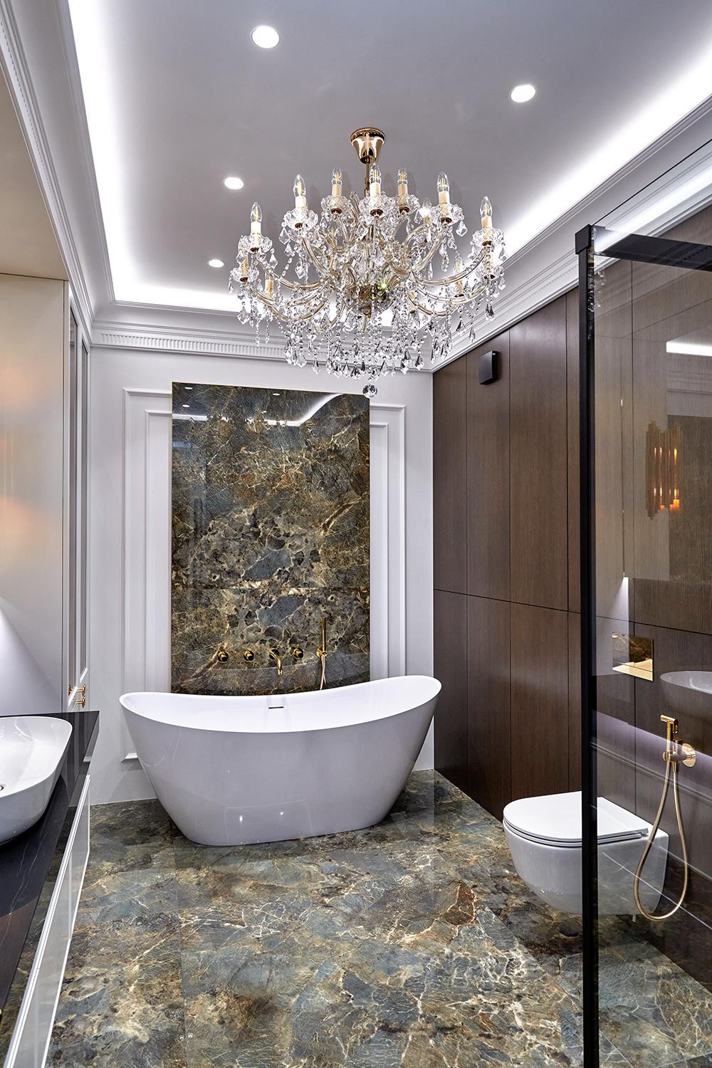 Просторный холл с отдельной гардеробной, ванная комната 10м2, отдельно стоящая ванна и просторная душевая, в отделке использованы премиальные европейские материалы, крупноформатный керамогранит MUSEUM, смесители испанской фабрики MAIER а так же LAUFEN, DURAVIT и NOKEN