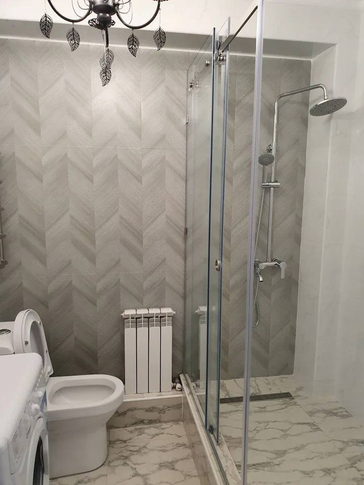 Ванная комната современного дизайна, включает в себя душевую кабину, умывальник и туалет.