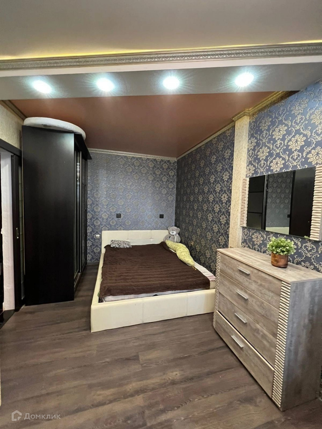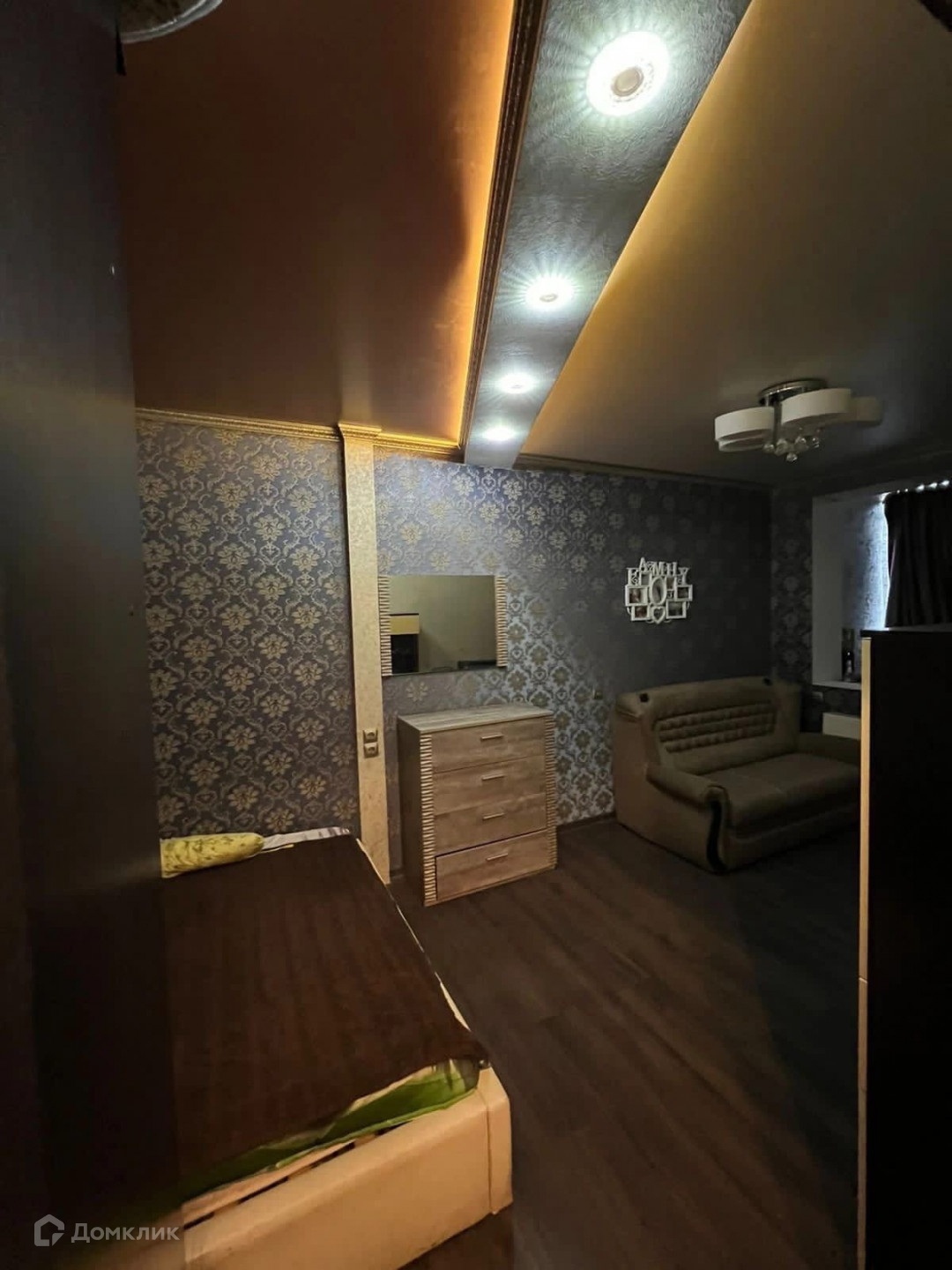 Двухуровневый потолок, отделенная спальная зона.