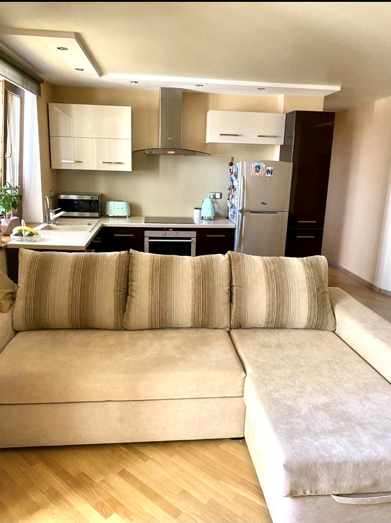 Квартира общей площадью 64,3 кв.м при ремонте была перепланирована: получилось две изолированные комнаты, гардеробная, санузел, балкон и лоджия, кухня-гостиная 36 кв.м.
