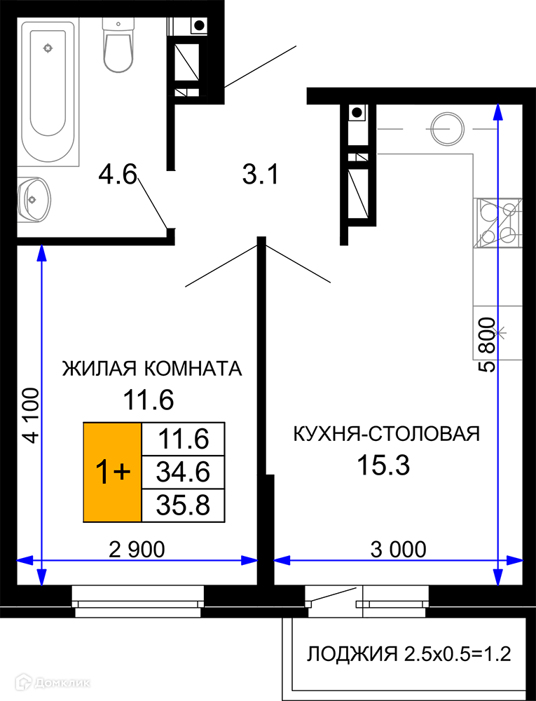 Общая площадь 35.8 м2