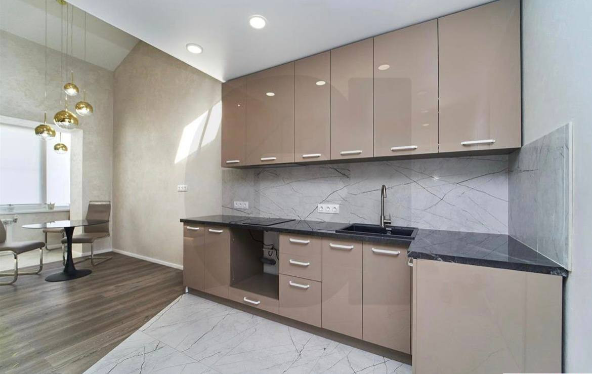 кухонная столешница из керамогранита (крепка, надежная, красивая, долговечная, износоустойчивая) фасады акриловые.