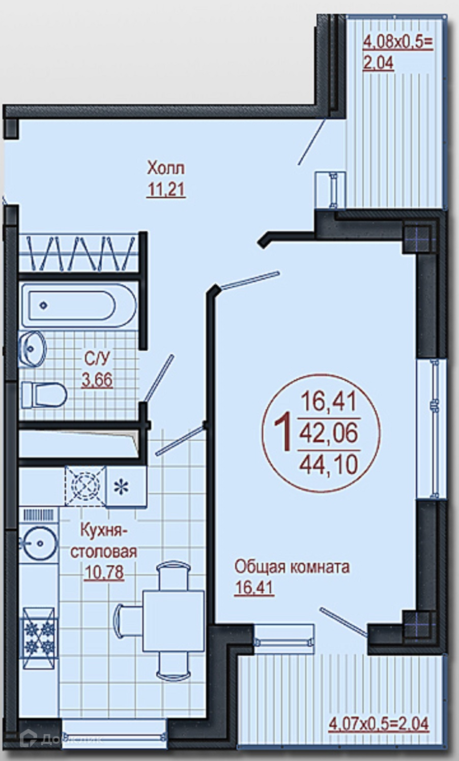 Общая площадь 44 м2