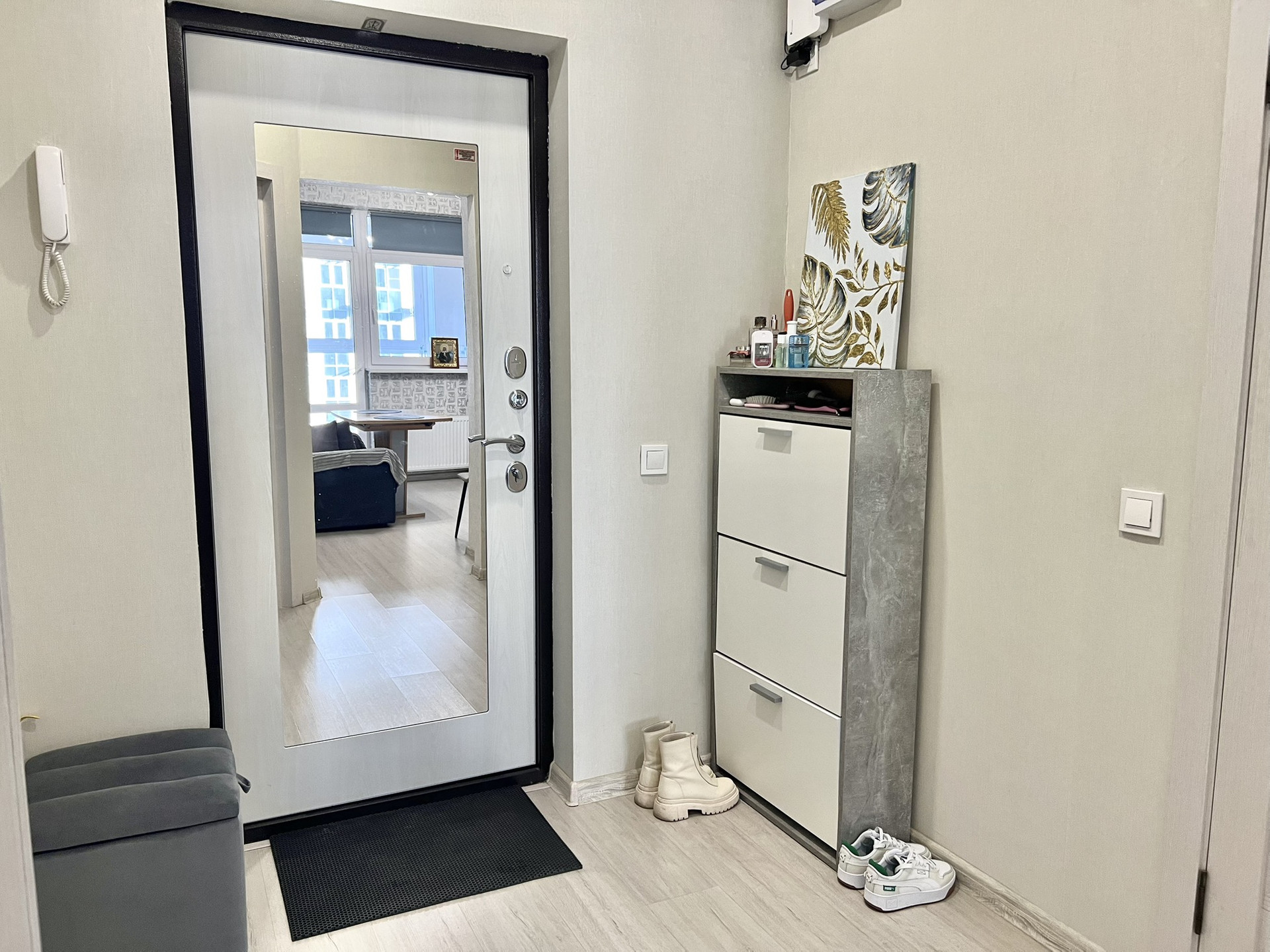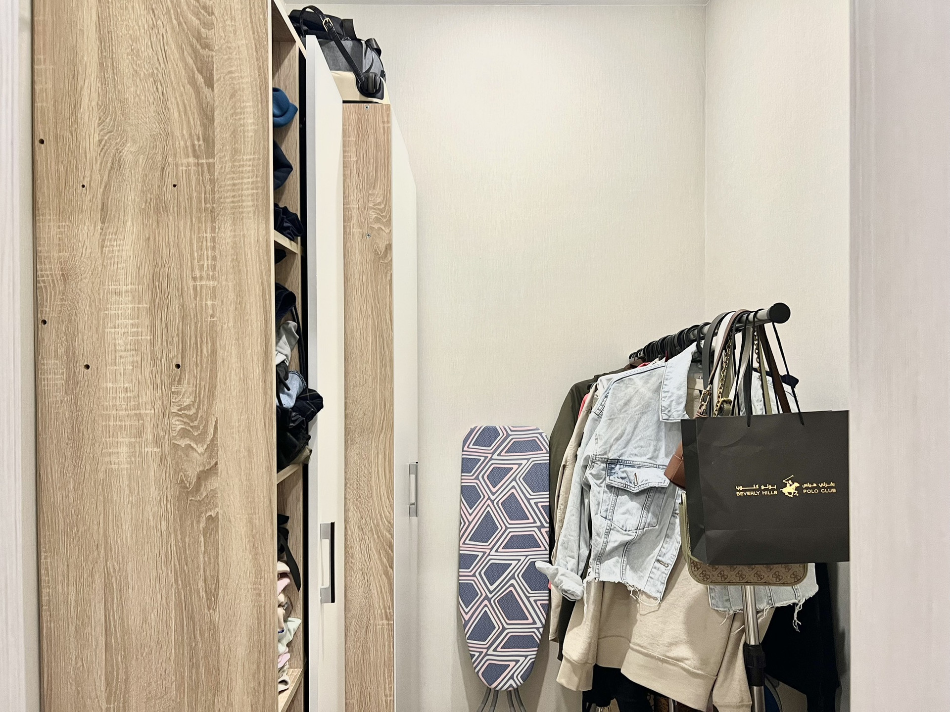 В квартире также есть просторная гардеробная, куда помещается несколько шкафов, рейлы для верхней одежды и комод (все остается).