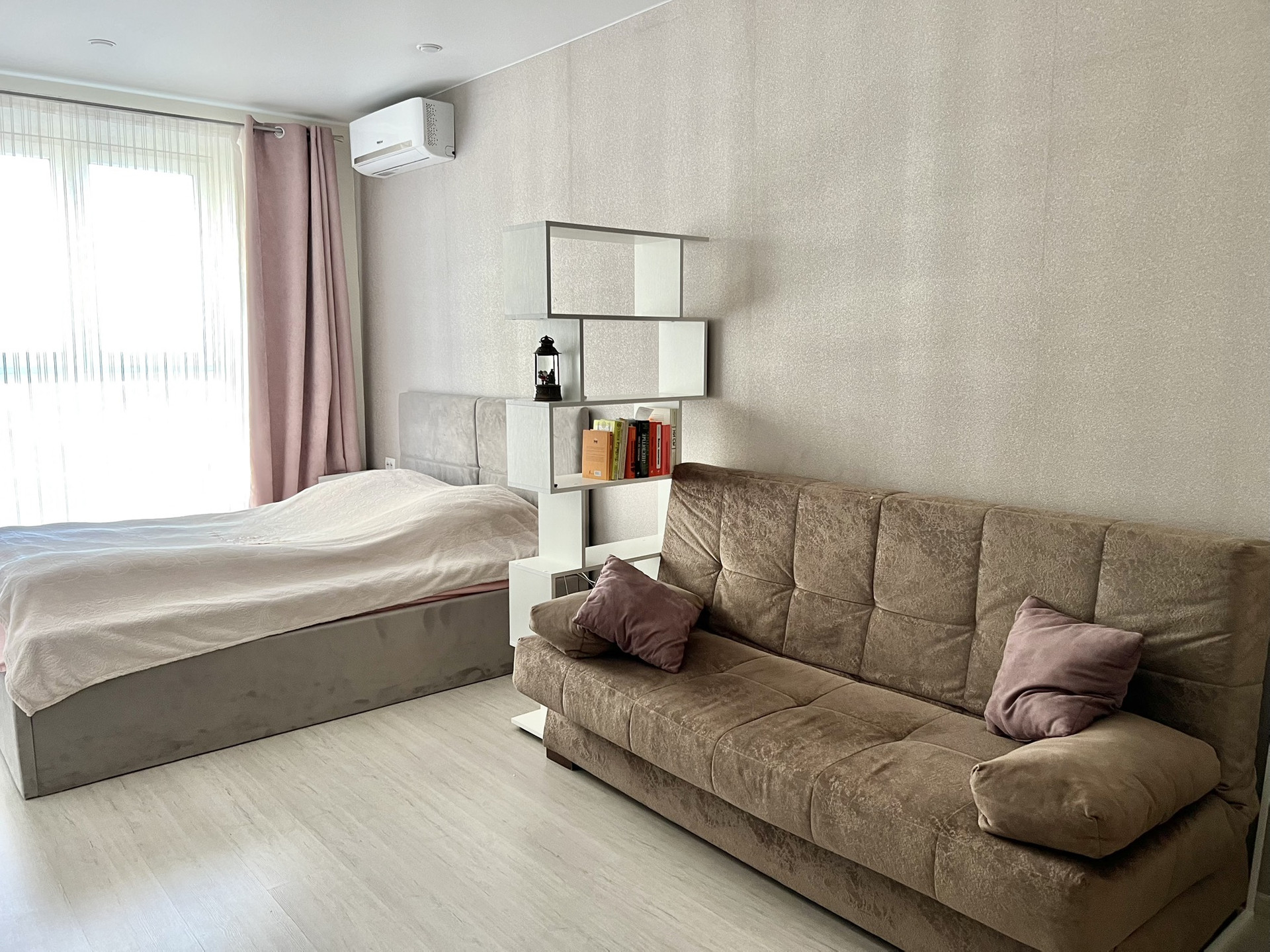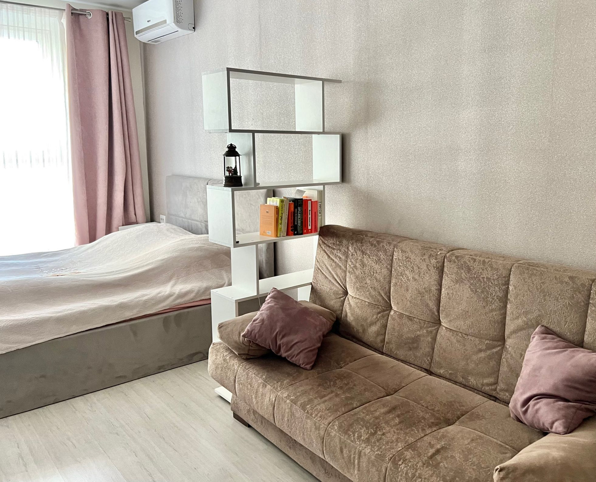 Комната поделена на 2 части: спальную зону и зону отдыха (диван, тумба под телевизор) + рабочая зона со столом для компьютера.