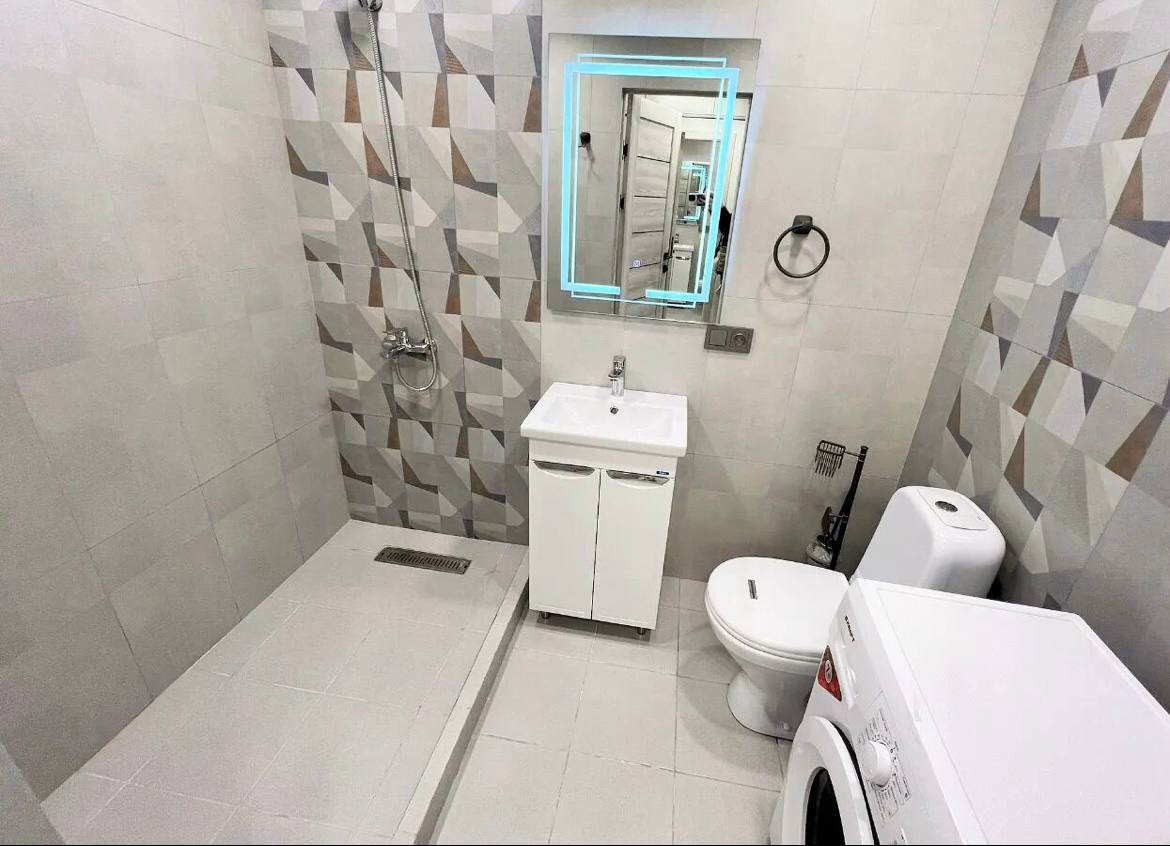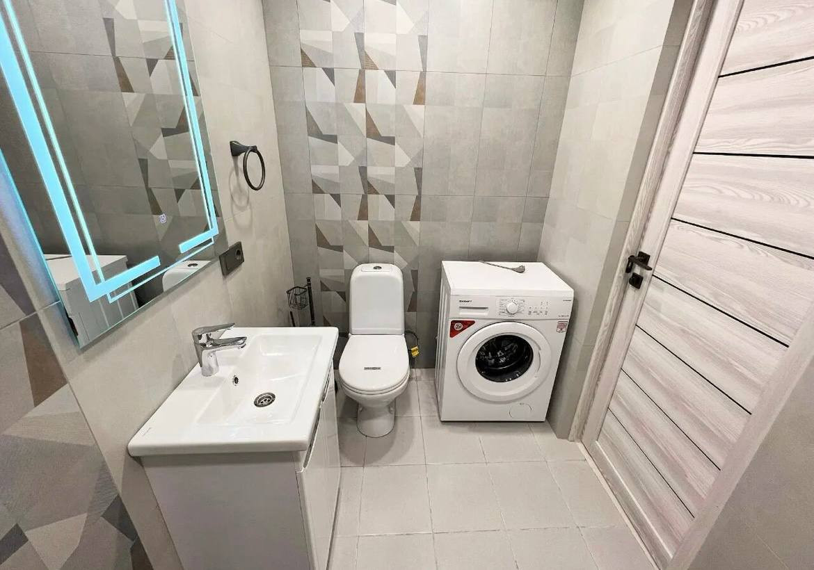 Современная ванная комната оборудована всем необходимым для комфортного проживания. Качественные отделочные материалы и сантехника создают ощущение роскоши.