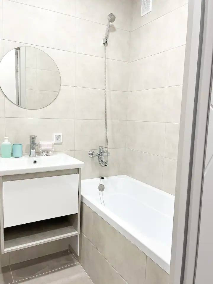 Cанузел, оформленный в стильном дизайне, оборудован всем необходимым и имеет большое зеркало, которое визуально расширяет пространство.
