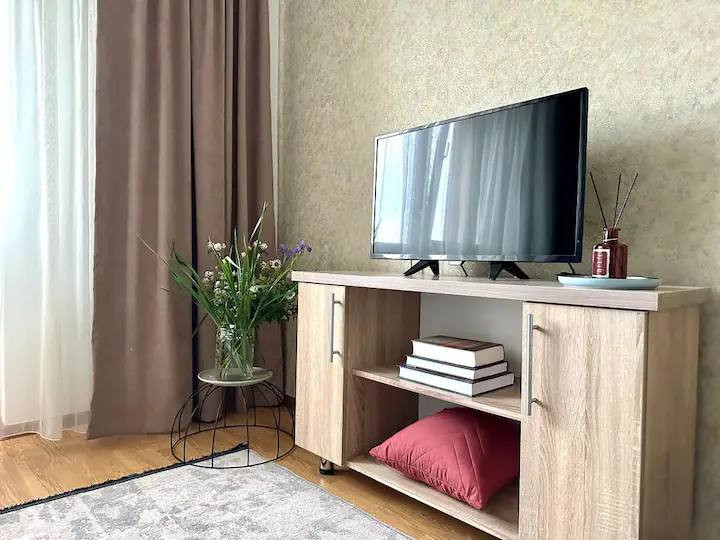 Студия расположена на высоком этаже, что позволяет наслаждаться потрясающим видом на город.