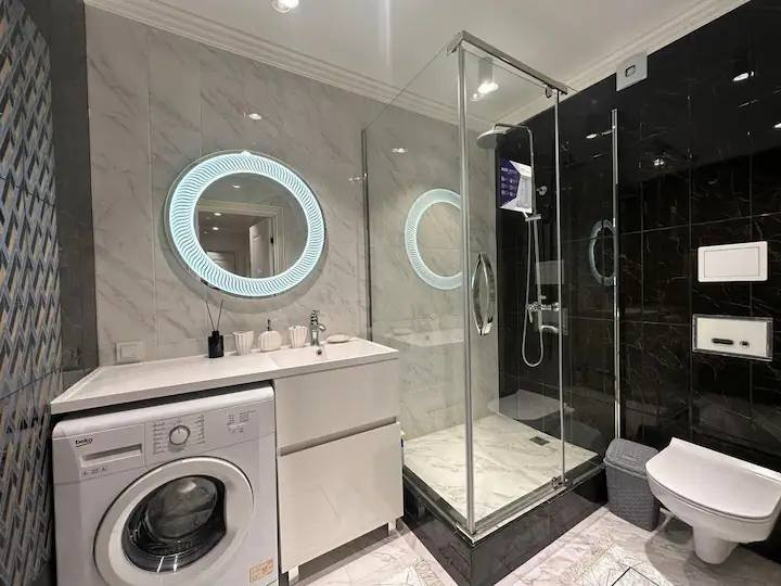 Cанузел, оформленный в стильном дизайне, оборудован всем необходимым и имеет большое зеркало, которое визуально расширяет пространство.