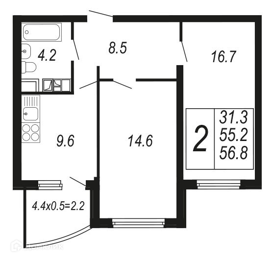 Общая площадь 56.8 м2