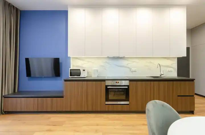 Современная кухня оборудована всем необходимым, чтобы приготовить вкусные блюда. Она имеет стильные столешницы и много места для хранения кухонной утвари. Здесь вы можете расположиться в любое время дня и наслаждаться приятной атмосферой и вкусными блюдами.