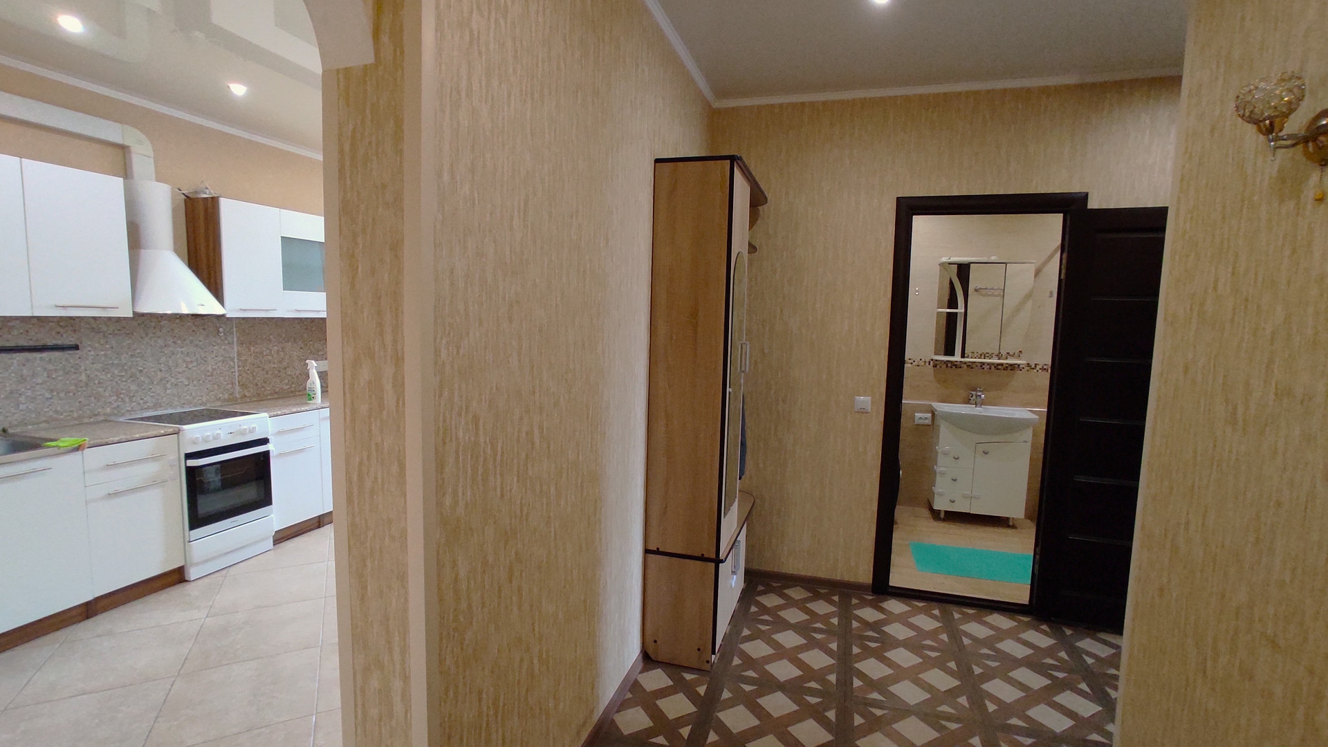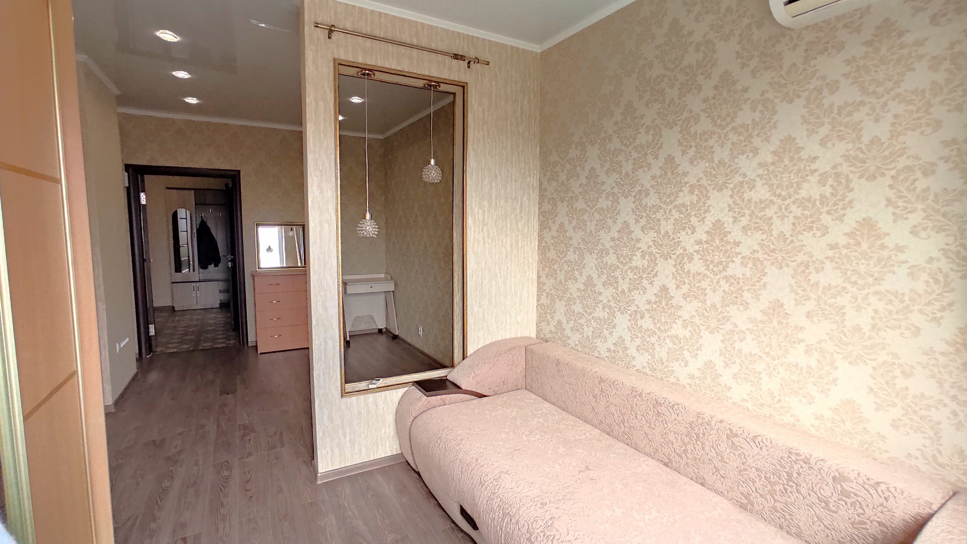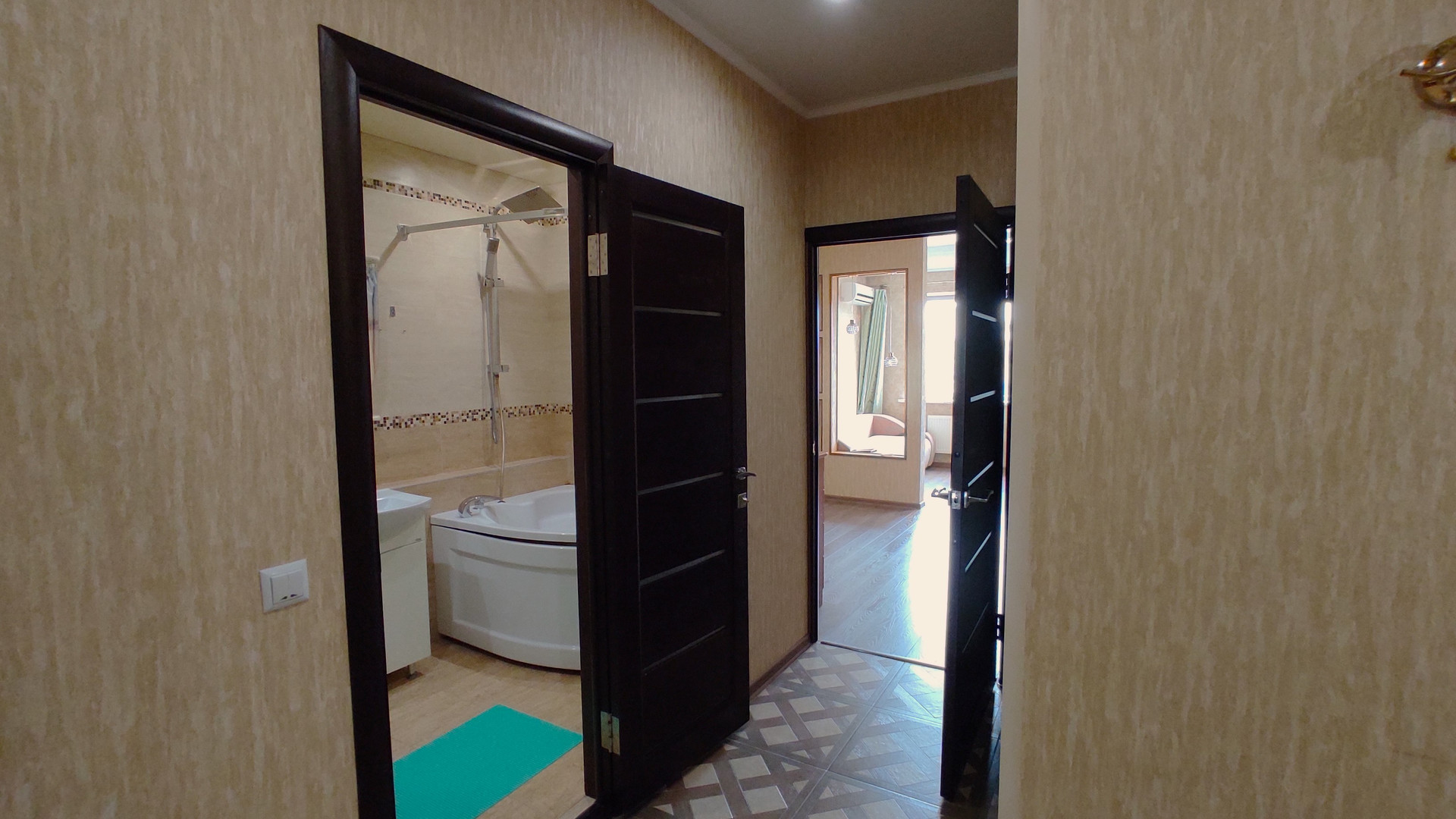 Качественный ремонт. В ванной - большая угловая ванна и тропический душ. В комнате - вместительный шкаф-купе и новый диван-кровать с отсеком для хранения.