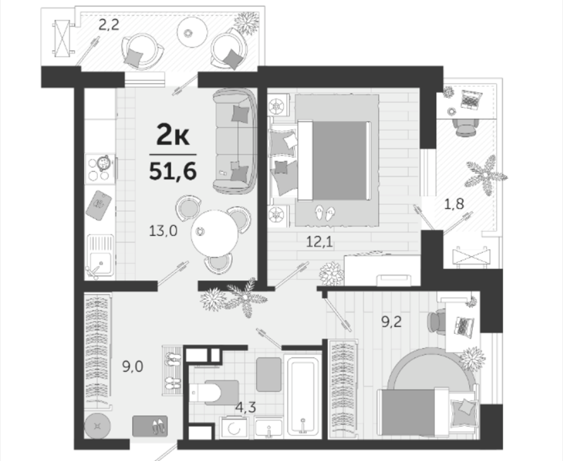 Общая площадь 51 м2