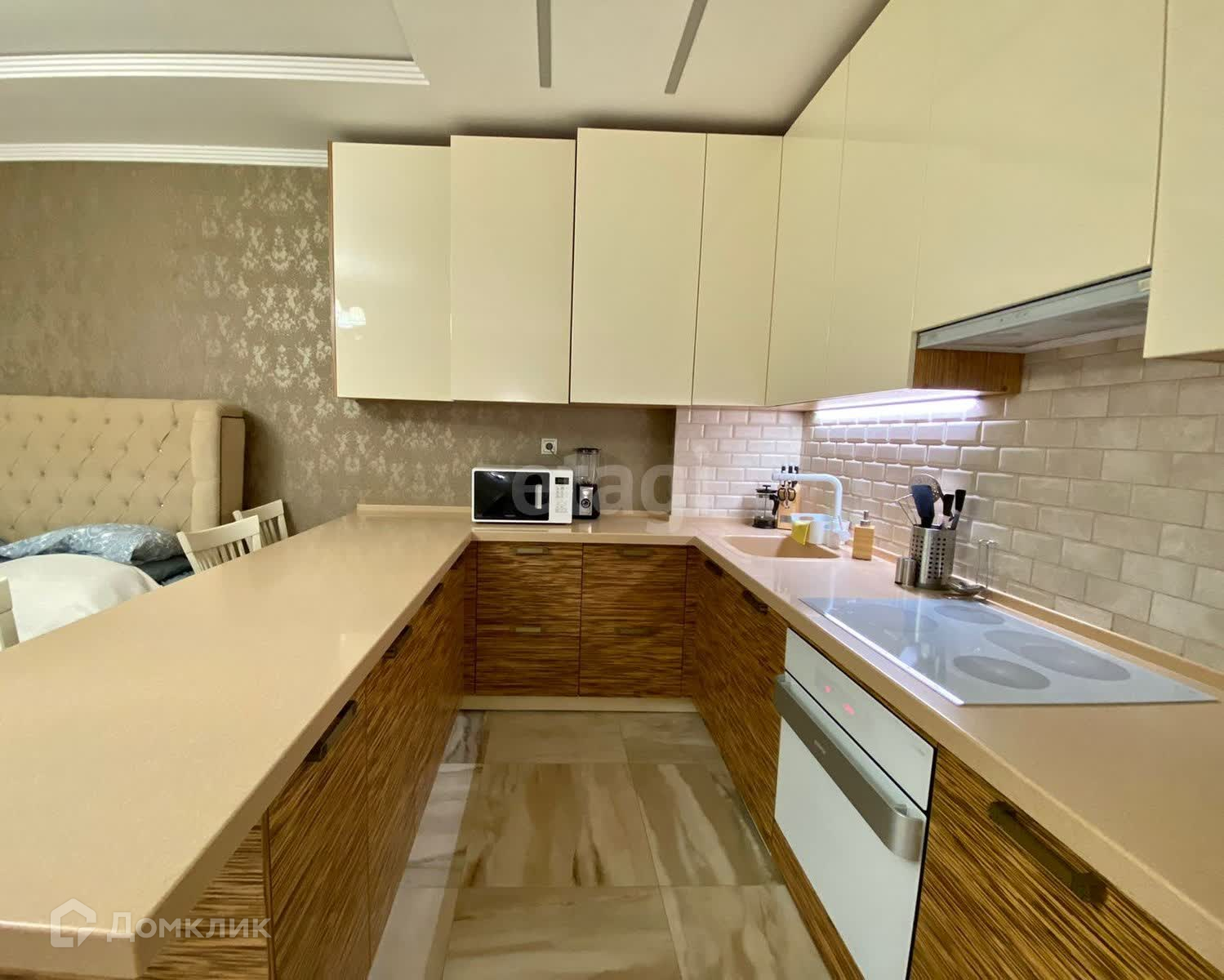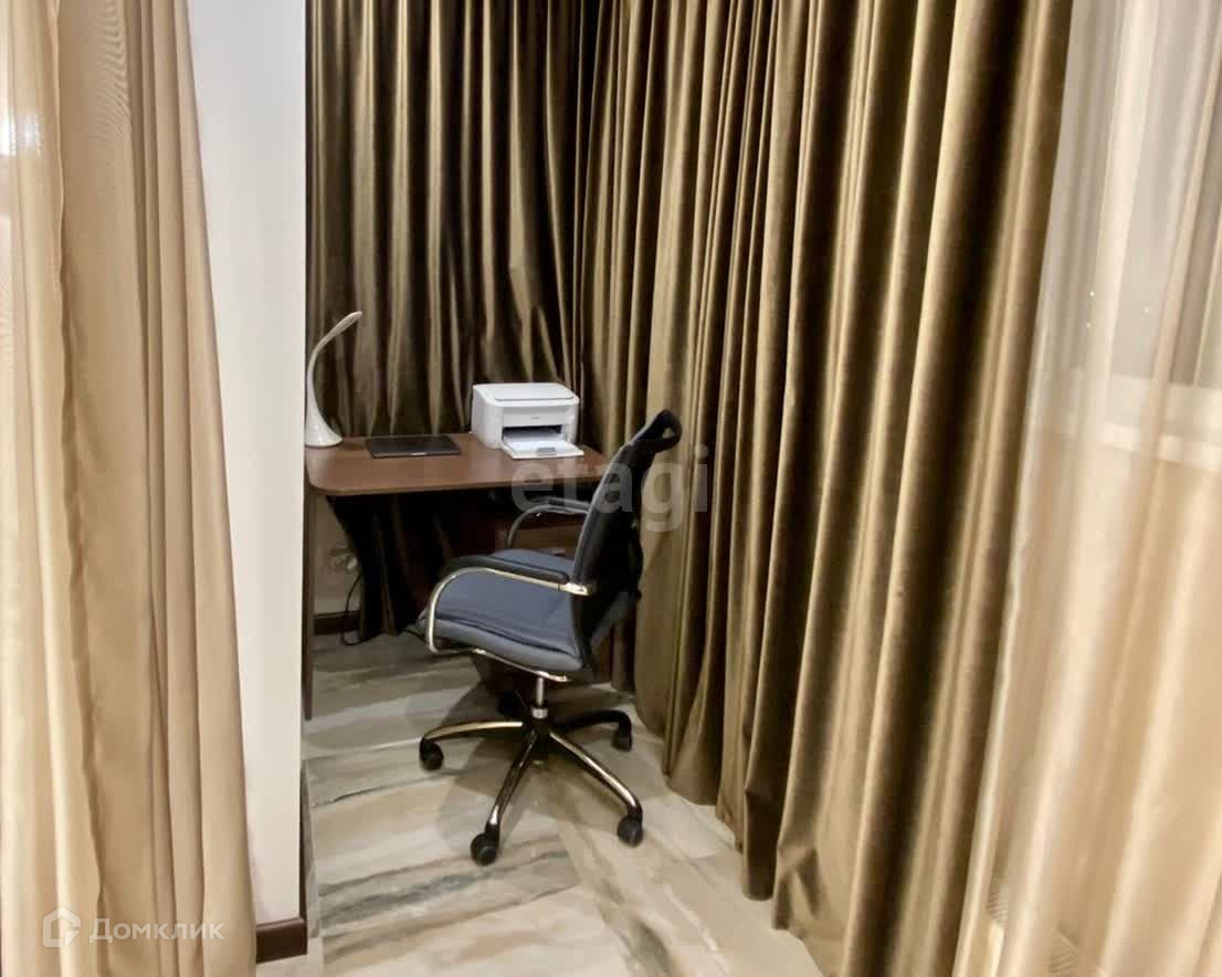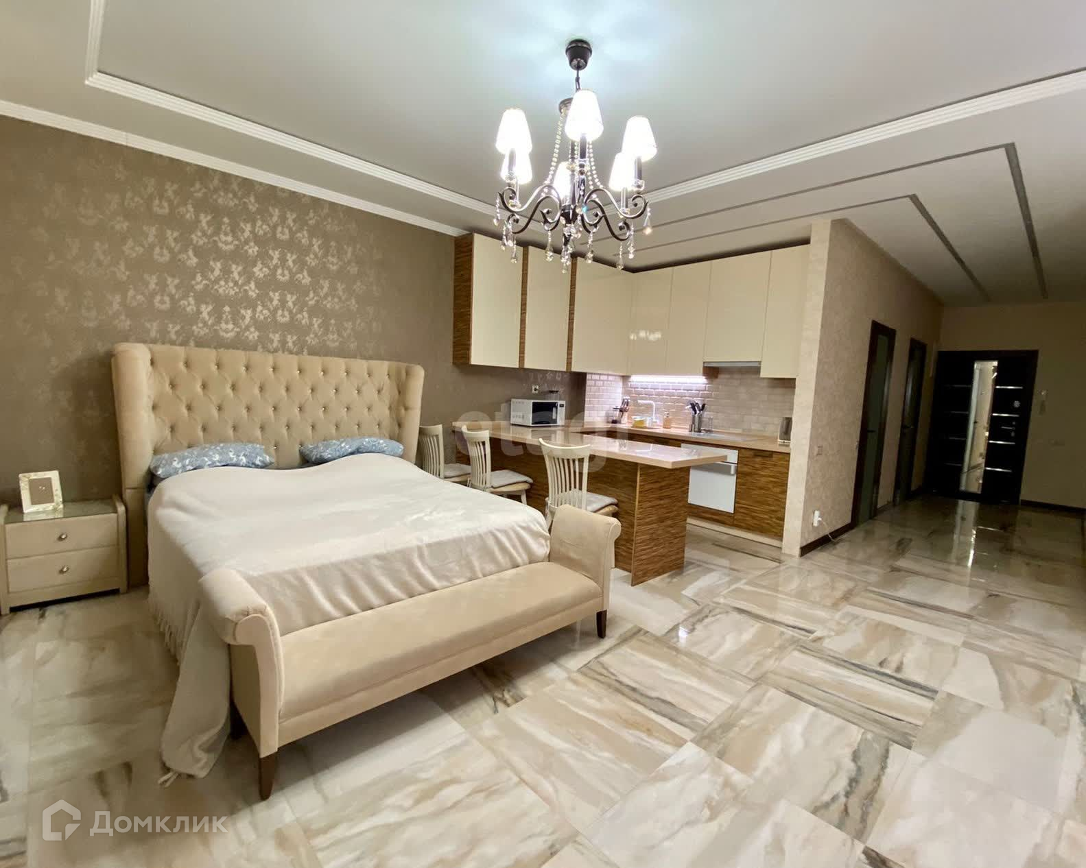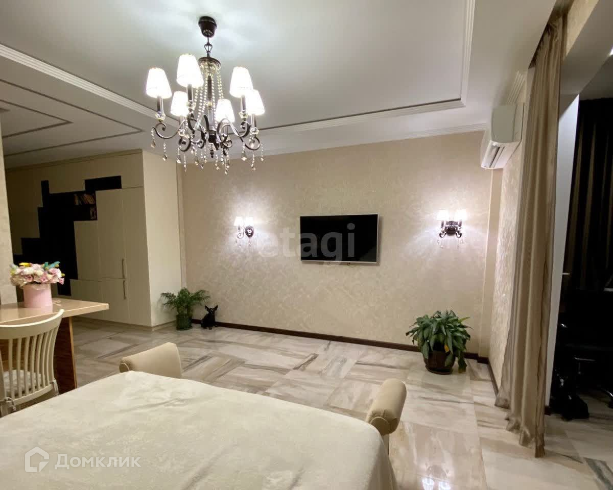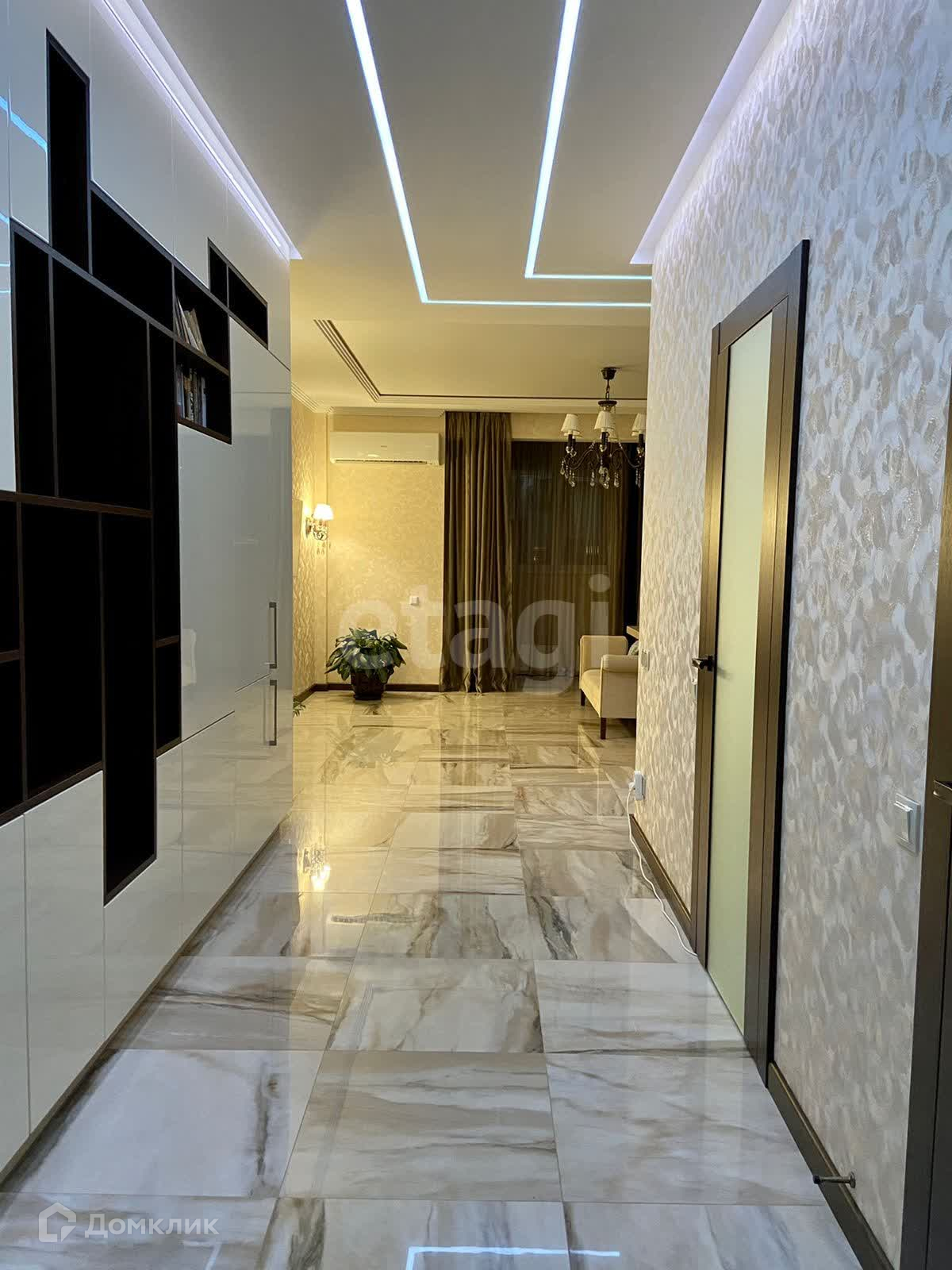 Выполнен дизайнерский ремонт из дорогостоящих материалов премиум-класса в светло-бежевых тонах и многоуровневым освещением. Во всей квартире предусмотрена возможность использования подогрева пола. Имеется гардеробная.