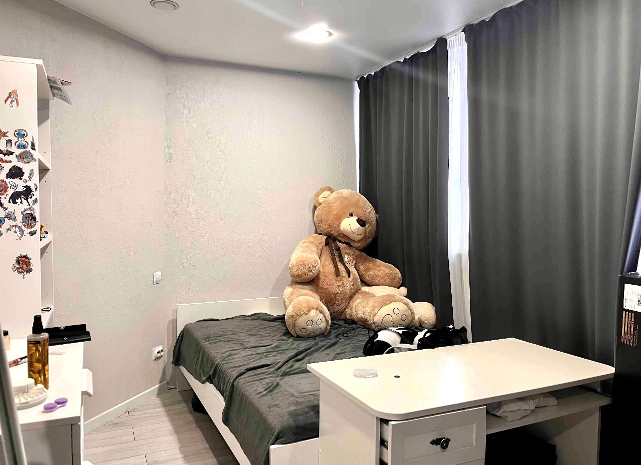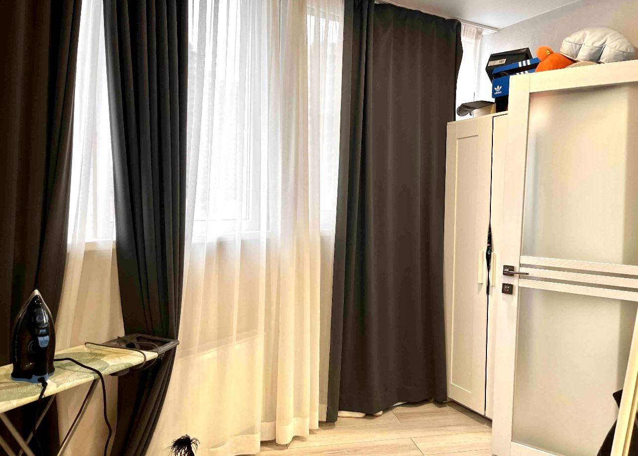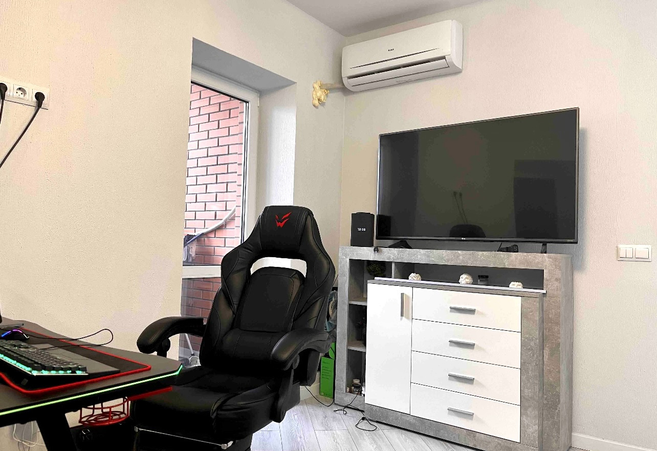 В квартире выполнен отличный ремонт в нейтральных оттенках: на полу — ламинат, стены — обои, натяжные потолки, молдинги и плинтусы, санузел отделан керамической плиткой, установлена сантехника, смесители, межкомнатные двери, сплит-системы.