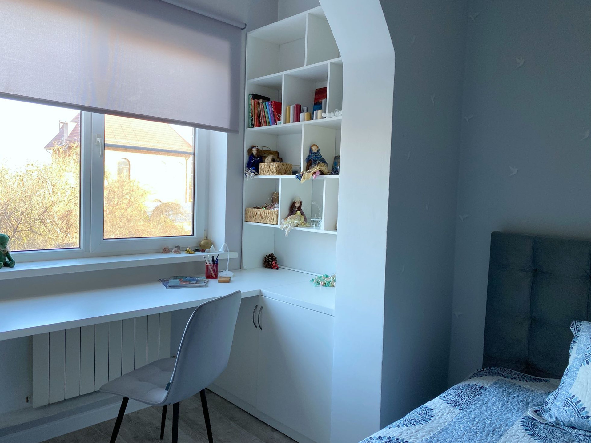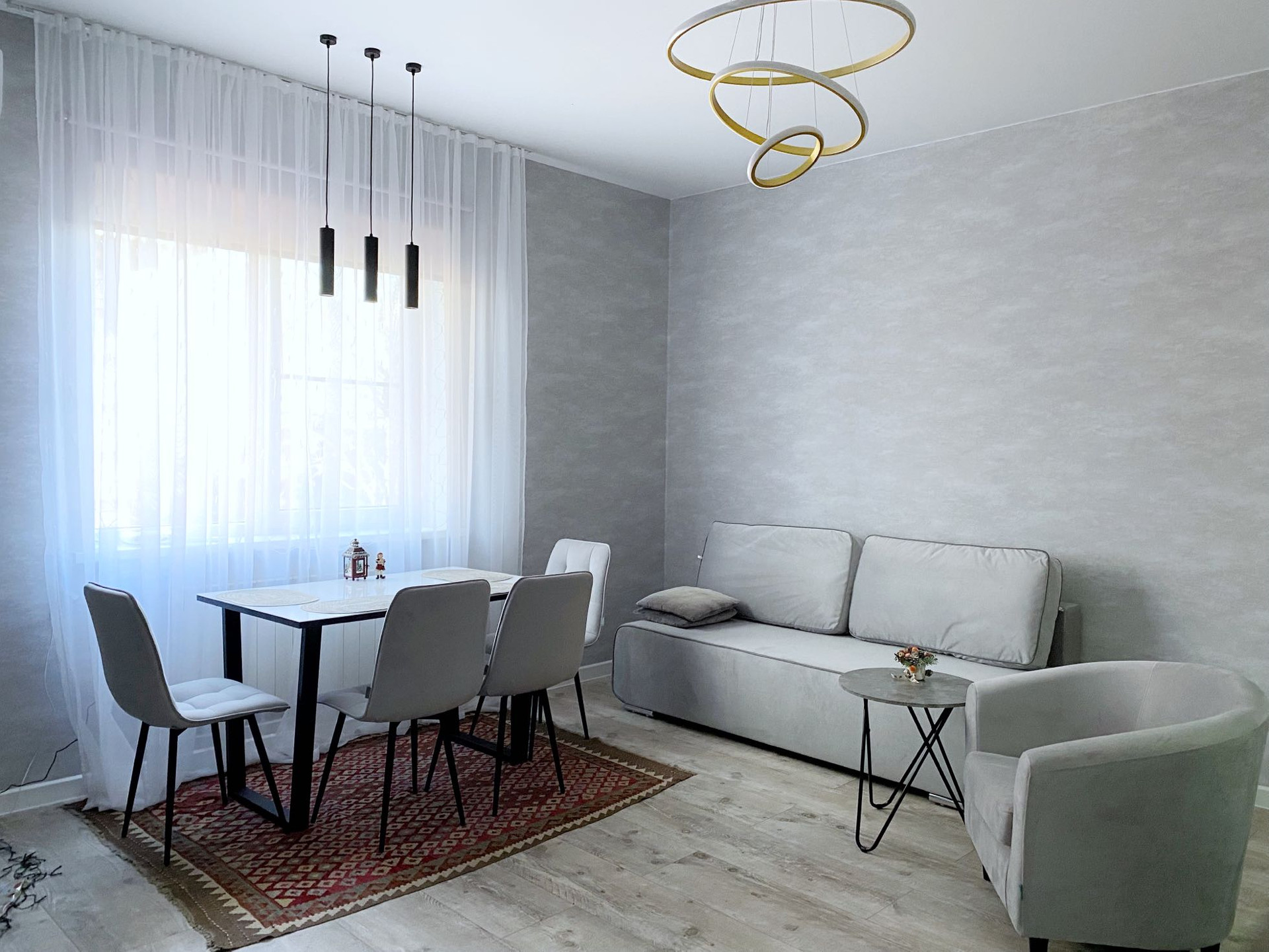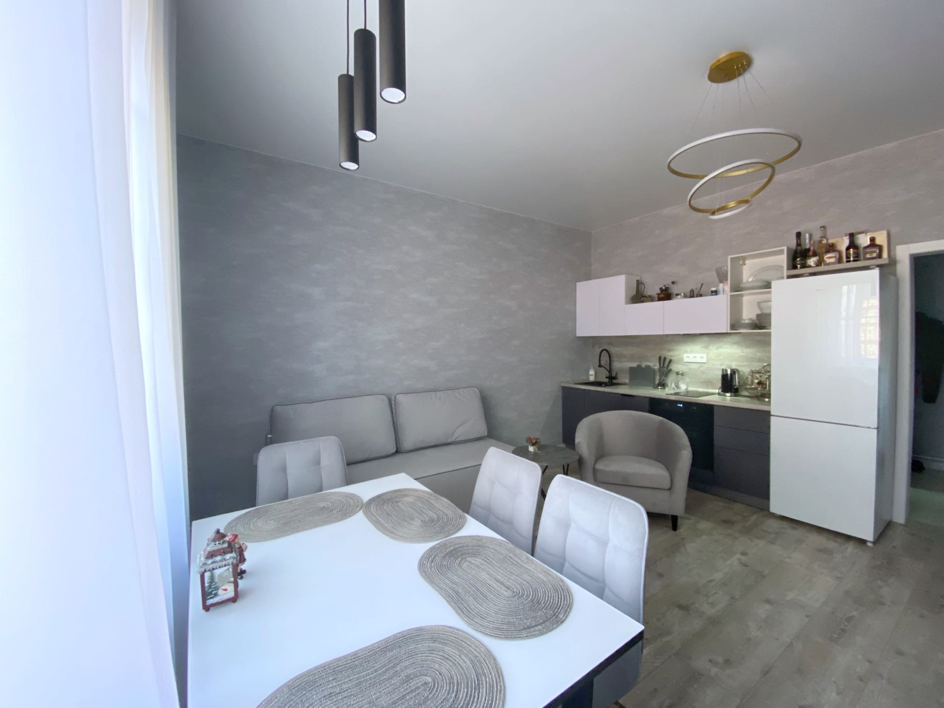 Сделан дизайнерский ремонт с качественных современных материалов , квартира в серо -голубых тонах , белые заказные межкомнатные двери , отличная новая сантехника, новый нагреватель и кондиционер ,полностью была проведена замена проводки , обои Германия , входная дверь с зеркалом , натяжные сатиновые потолки ,красивые современные люстры ,на окнах установлены жалюзи , тонкие капроновые шторы !!! Вся укомплектована , импортная бытовая техника , новая мебель ( аксона)
