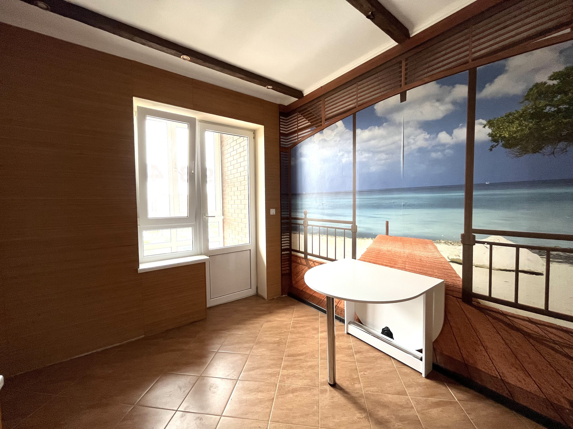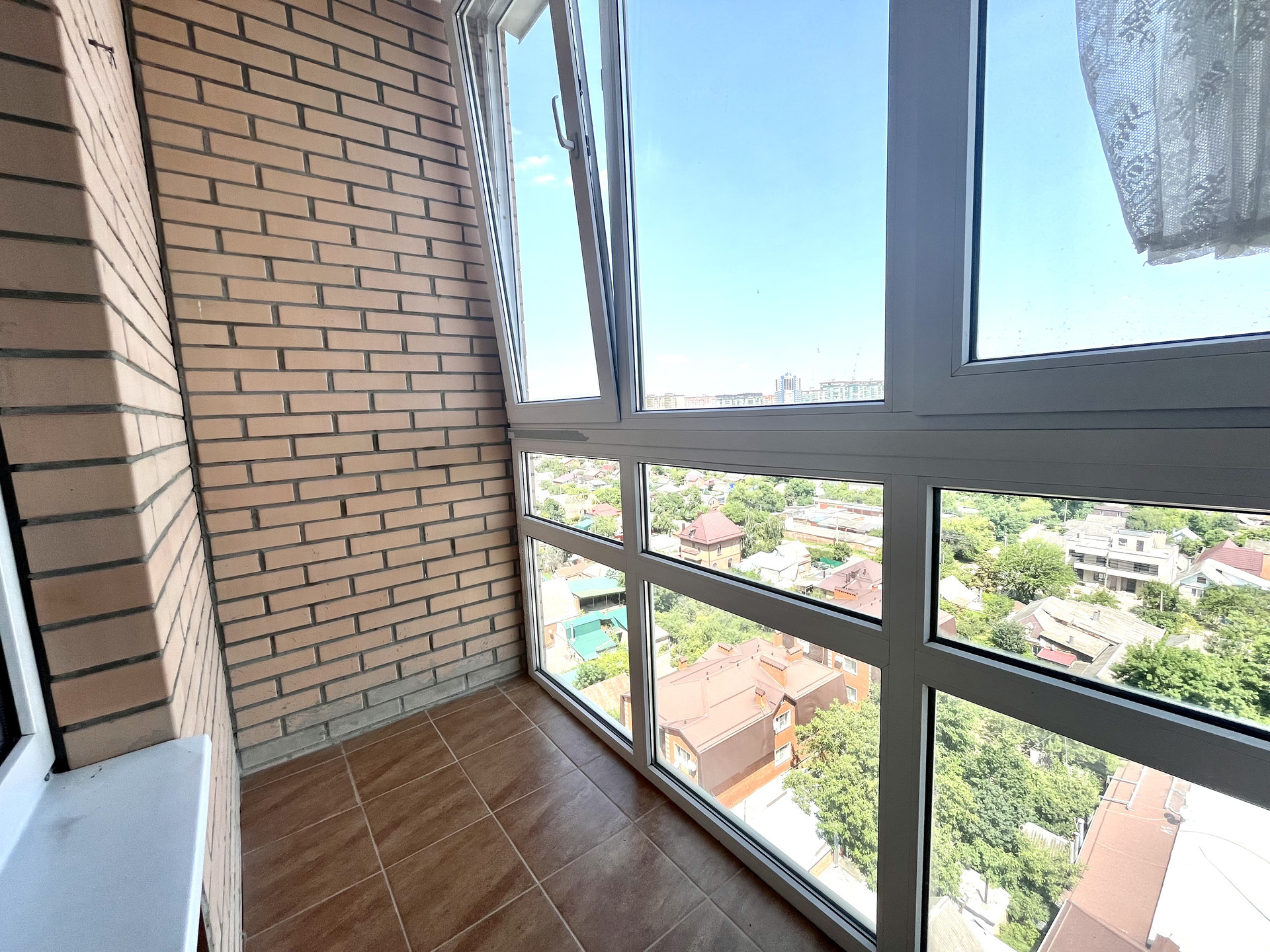 · кухня с выходом на лоджию с панорамным остеклением, откуда открывается шикарный вид на город