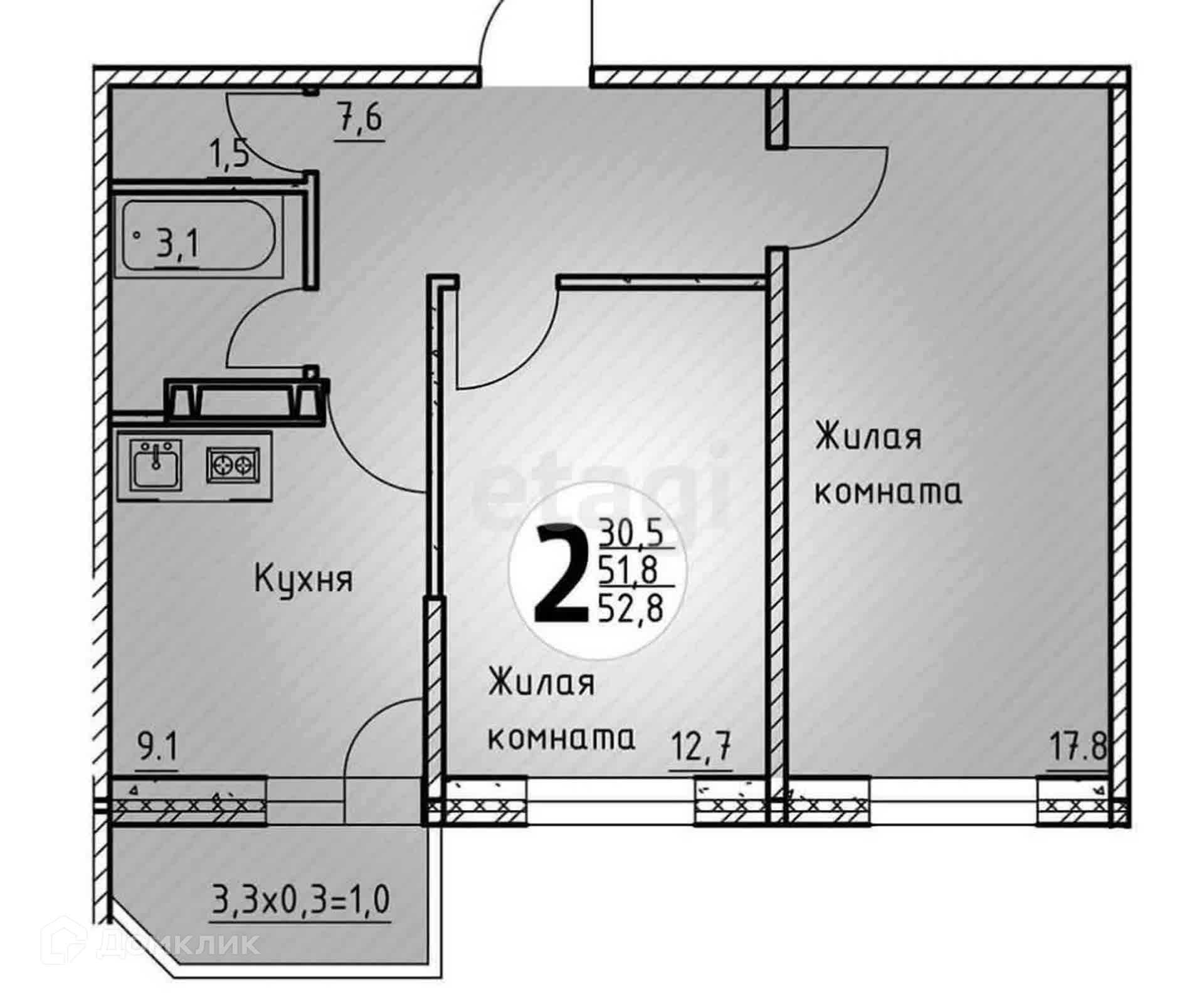 Общая площадь 52.9 м2