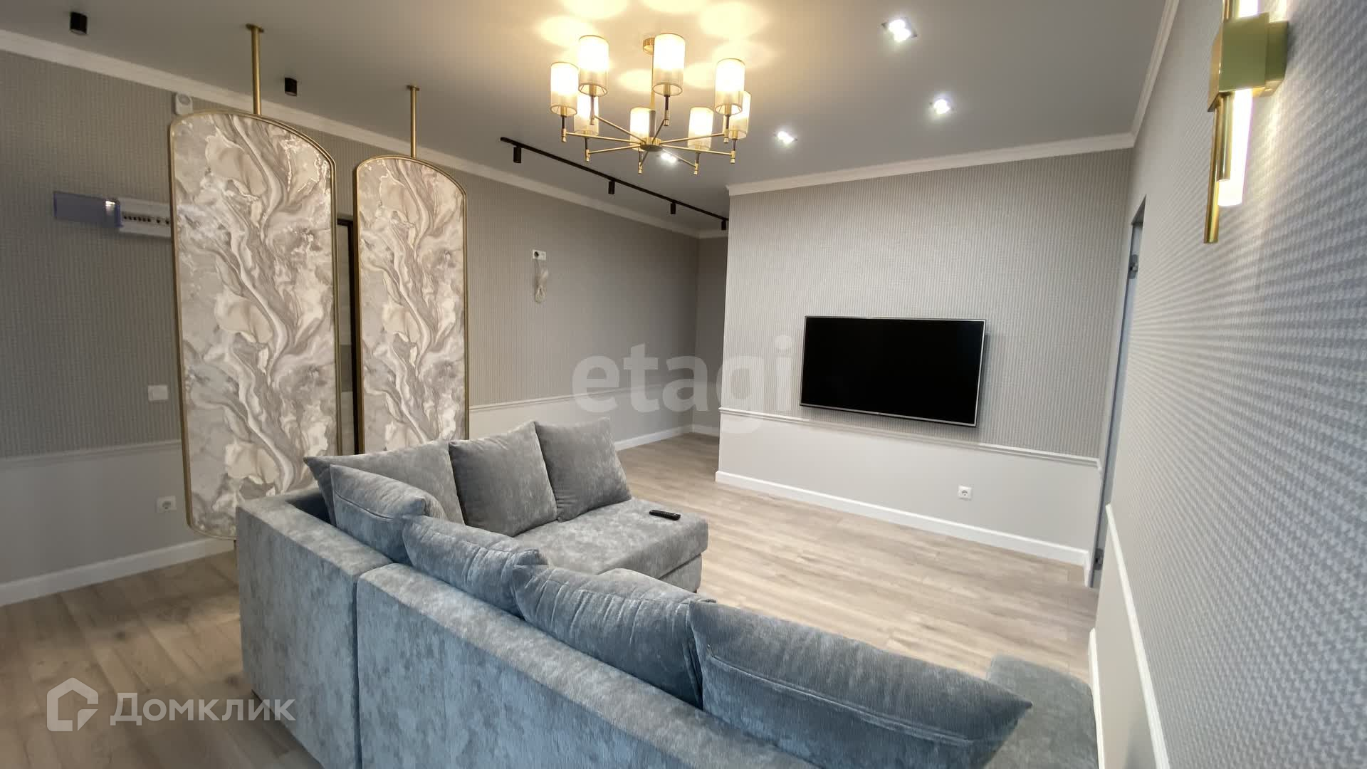 Полы ламинат, плинтус МДФ, окна пластиковые, витраж алюминиевый, двери классические и скрытого монтажа, стены окрашенные+ декоративные обои, при входе установлены декоративные перегородки в виде поворотных зеркал с декором, установлены светильники, люстры, торшеры и трековая система.